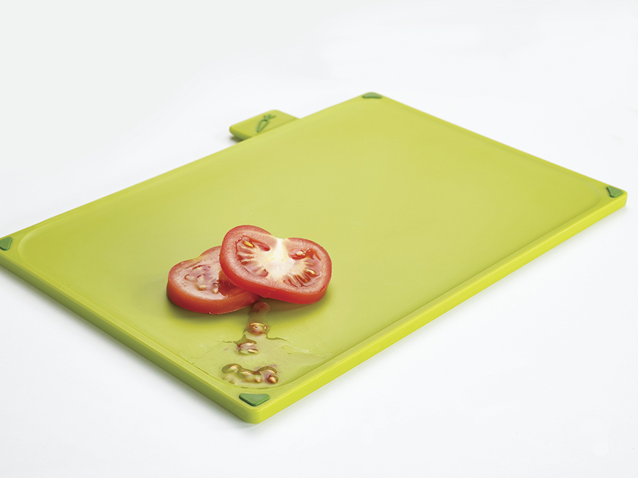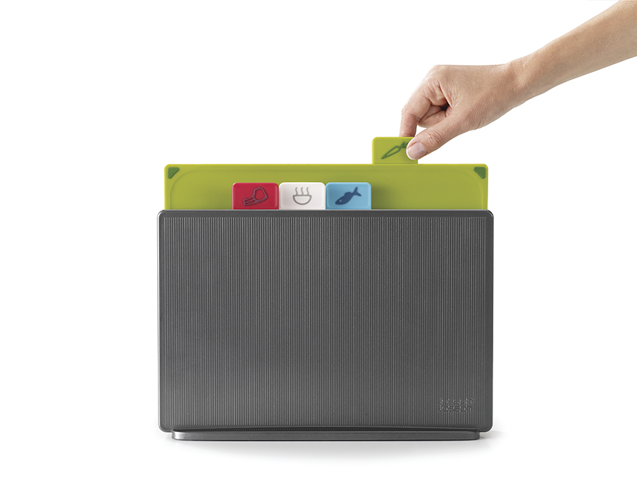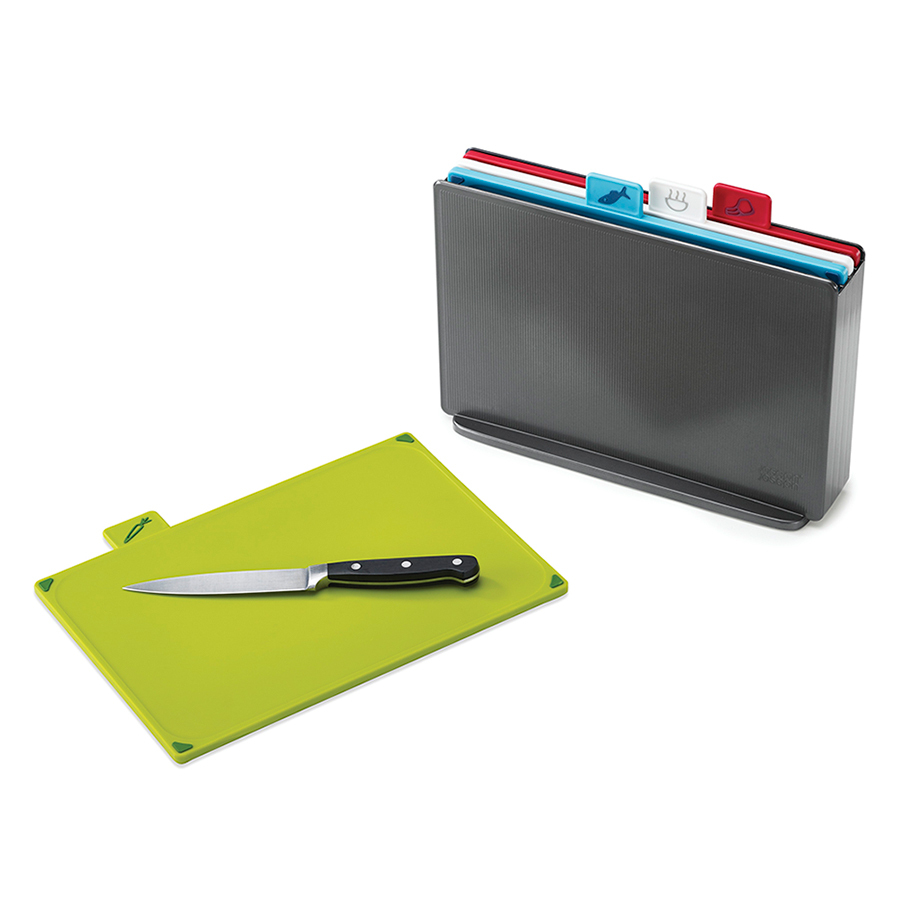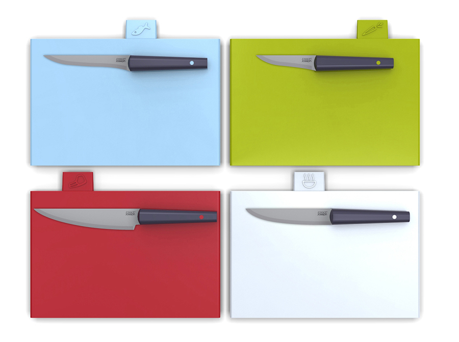 Теперь все доски в наборе с одинаковой плоской поверхностью и закругленными краями, удерживающими сок и крошки. Благодаря обновленной форме кейса набор занимает еще меньше места и вписывается в современные интерьеры кухонь. Простая и вместе с тем эффективная маркировка позволяет легко распределять доски для разных типов продуктов, сохраняя максимальную гигиену в процессе нарезки и исключая взаимное загрязнение продуктов. Специальные ярлыки помогают определить какую доску следует использовать для разных ингредиентов: сырого мяса, овощей, рыбы или же хлеба. Силиконовые ножки на досках препятствуют скольжению. Инновационное покрытие досок не дает ножам затупиться.