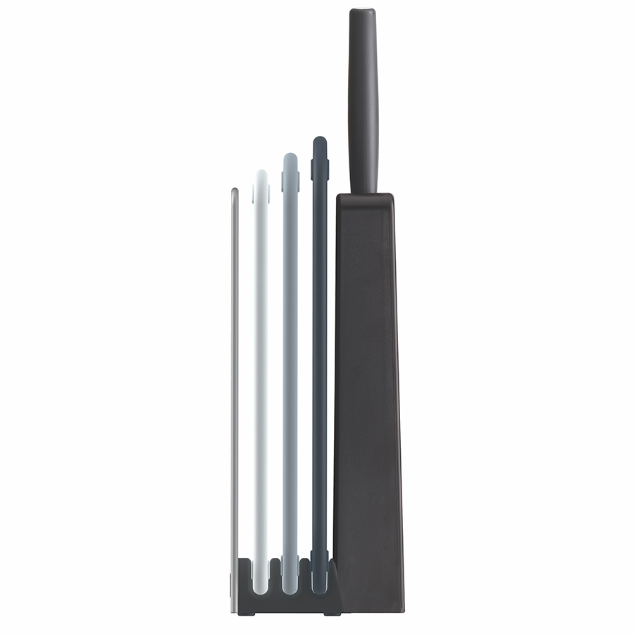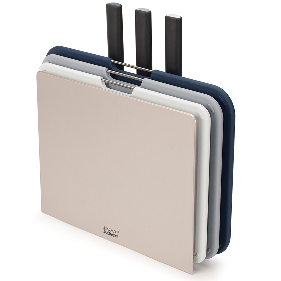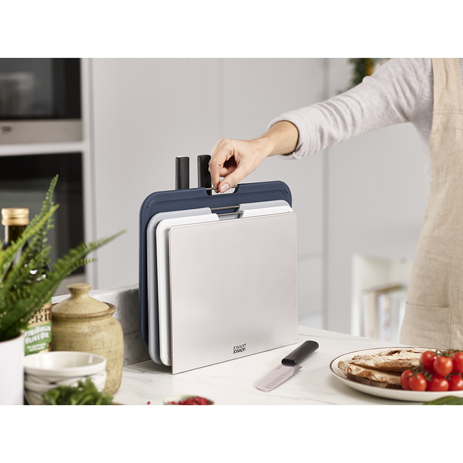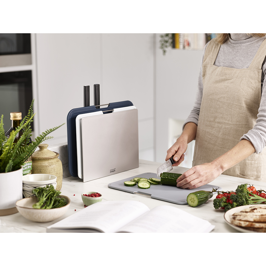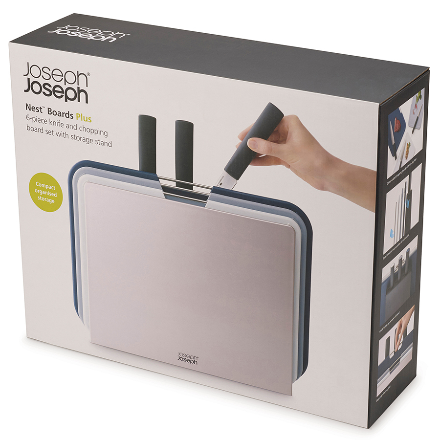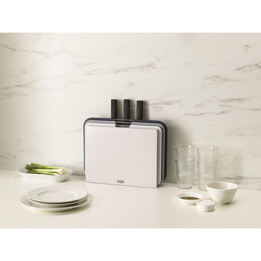 Этот набор включает в себя три разделочные доски разных цветов, три основных кухонных ножа и изящную подставку для экономии места на вашей рабочей поверхности.
