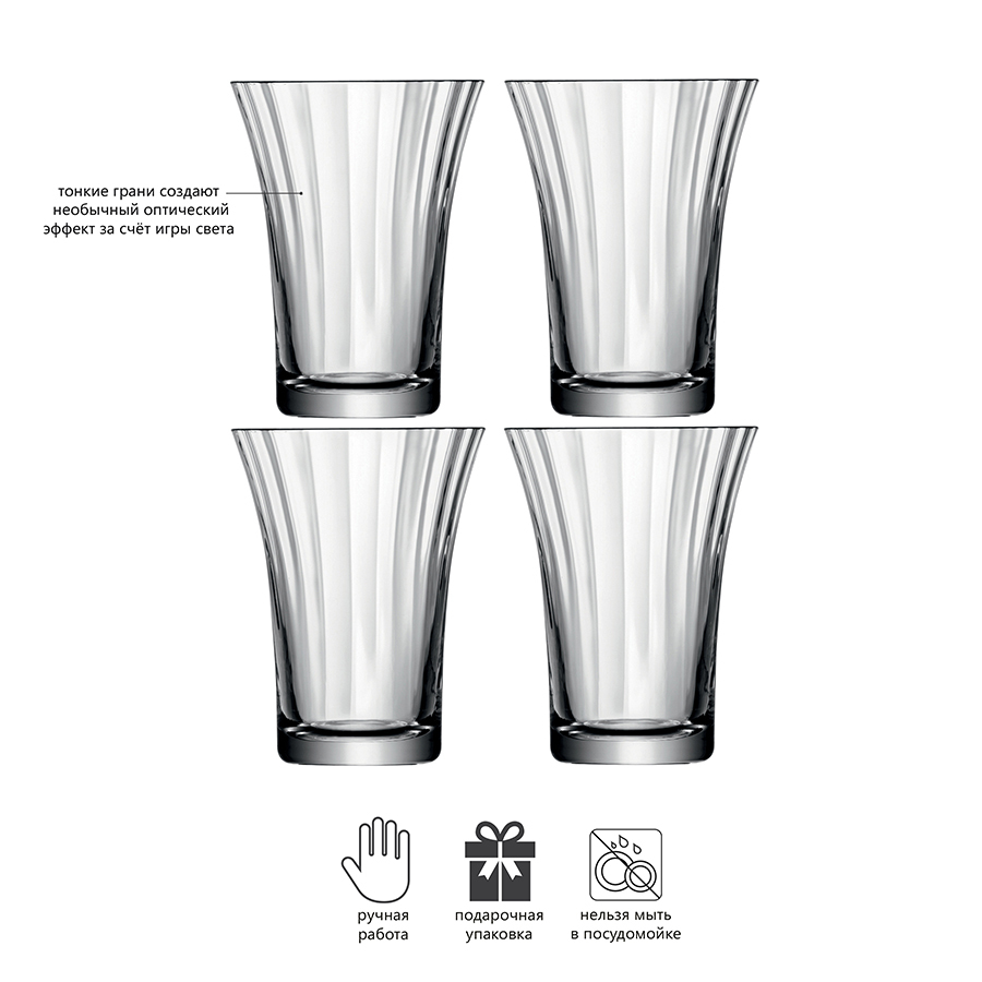 Добавьте изысканности вашей сервировке с классическими стаканами Aurelia, которые подойдут для сервировки безалкогольных, крепких алкогольных напитков и коктейлей. Комбинируйте их с бокалами для красного вина и шампанского, чтобы создать завершенную композицию. Бокалы упакованы в стильную коробку, поэтому станут отличным подарком. Набор состоит из 4-х бокалов. Объем каждого бокала 340 мл. Предметы коллекции Aurelia выполнены из прозрачного выдувного стекла. Особенности коллекции — тонкие грани, создающие необычный оптический эффект за счет игры света, и удлиненные тонкие ножки бокалов. Изысканная и утонченная Aurelia — идеальный выбор для торжественных и официальных мероприятий. Изделия рекомендуется мыть вручную в тёплой мыльной воде и вытирать насухо мягкой тканью. Мелкие пузырьки внутри выдувного стекла не являются браком (круглые пузырьки < 3 мм и овальные пузырьки < 5 мм): это допустимые индивидуальные особенности изделий, изготовленных вручную.