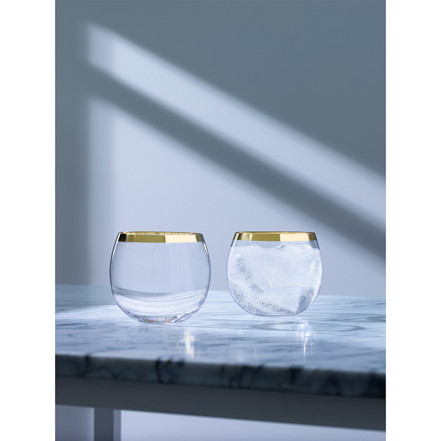 Стаканы из коллекции Luca станут не только функциональным элементом сервировки, но и украшением любого интерьера. Их сферическая форма создает ощущение невесомости и визуально расширяет границы пространства. При каждом движении, свет играет на поверхности стекла, а золотистые акценты усиливают его сияние.