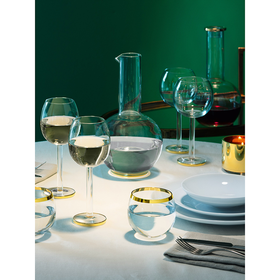 Luca – коллекция посуды необычной округлой формы с минималистичным декором в виде золотистой каймы, выполненная из выдувного стекла ручным способом.