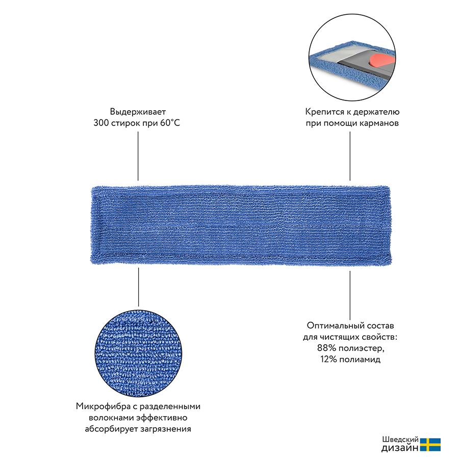 Сменная насадка из микрофибры – практичный аксессуар, который поможет значительно упростить процесс уборки. Он быстро впитывает воду и эффективно справляется с пылью, разлитыми жидкостями и грязью. Микрофибра подходит для напольных покрытий из кафеля, дерева и линолеума. Насадка легко крепится к швабре с помощью специальных кармашков, что очень удобно при сухой и влажной уборке. Микрофибра выдерживает до 300 стирок при температуре до 60?.