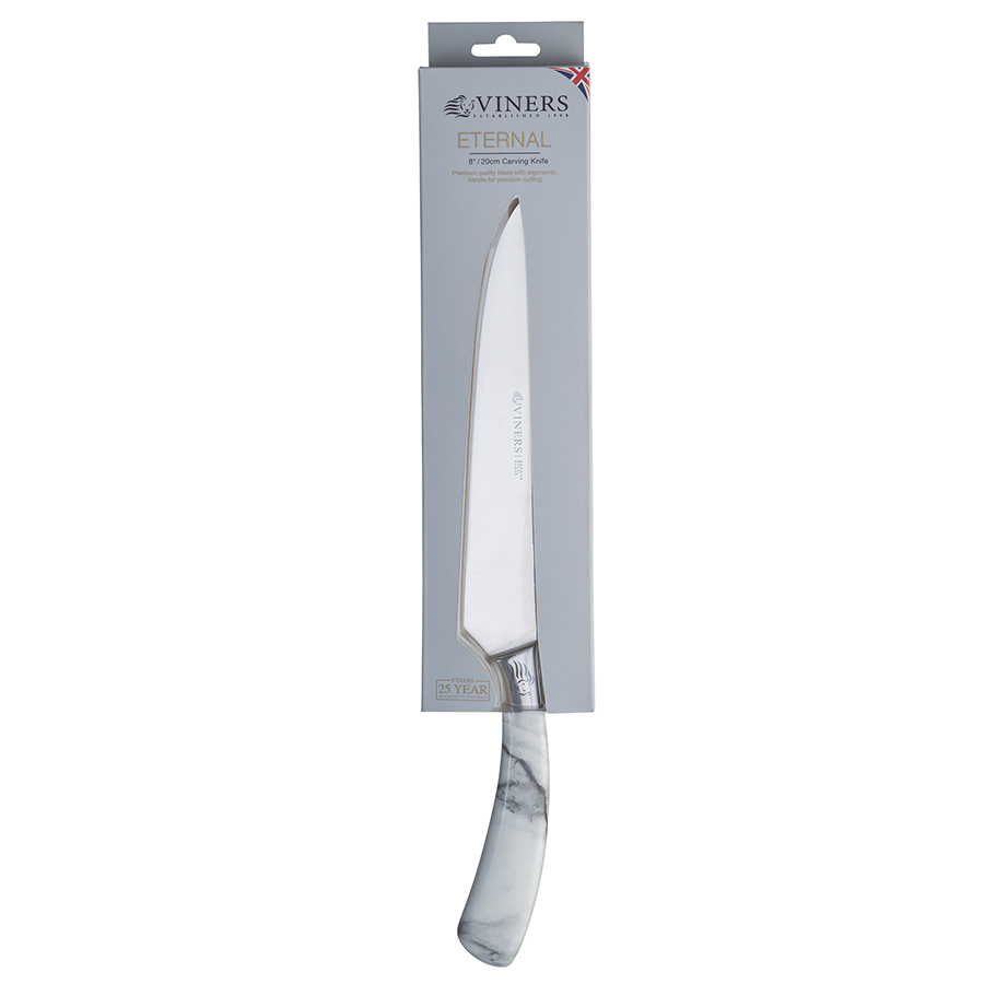 Нож с лезвием 20 см из углеродистой стали подходит для обвалки мяса и нарезания тонкими ломтиками и небольшими кусками готового блюда из мяса и птицы. Кухонные ножи Eternal Marble не рекомендуется мыть в посудомоечной машине, т.к. это может негативно сказаться на заточке лезвий. Eternal Marble — роскошная коллекция ножей из немецкой стали, которая производится по самым высоким стандартам качества. Лезвия выполнены из углеродистой стали. Благодаря этому они обладают повышенной прочностью и годами сохраняют остроту. Ножи оснащены удобными рукоятками из нержавеющей стали, стилизованными под мрамор. С помощью ножей Viners любой повар может добиться безупречных кулинарных результатов. Изысканный набор ножей подчеркнет стиль вашей кухни. Бренд Viners даёт гарантию на коллекцию 25 лет.