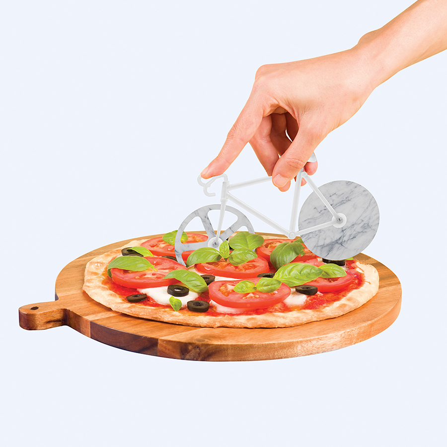 Дизайн: Нож для пиццы The Fixie Terrazzo имеет интересный нестандартный дизайн – он выполнен в виде двухколесного велосипеда. Благодаря двум острым ножам-колесам пиццу легко можно разрезать на нужное количество частей. Для удобства хранения предусмотрена специальная металлическая подставка. Материал: нержавеющая сталь.