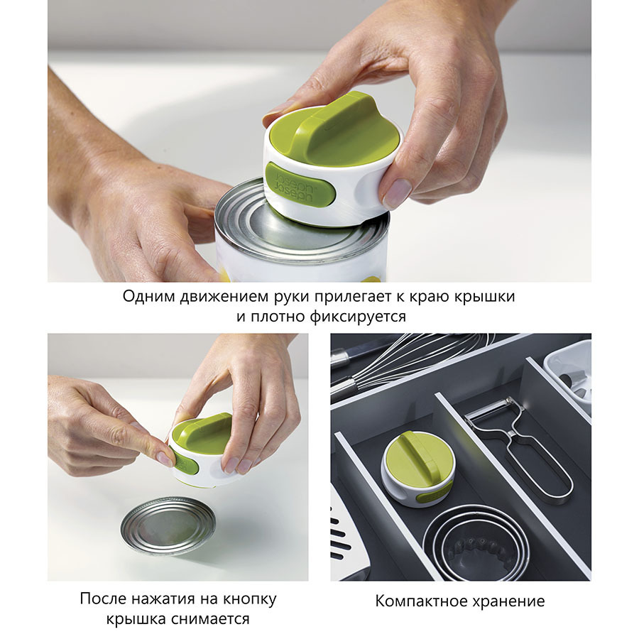 Компактный продуманный прибор с удобной рукояткой. Всего одним движением руки прилегает к краю крышки и плотно фиксируется, после чего банку можно быстро открыть при помощи удобного поворотного механизма. Чтобы полностью снять крышку, достаточно нажать на специальную кнопку. Инструмент одинаково удобен и для правшей, и для левшей. Консервный нож нельзя погружать полностью в воду, рекомендуется протирать влажной тканью.