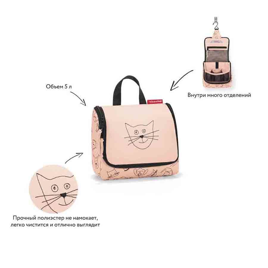 Практичная сумка-органайзер для маленьких путешественников! Она очень удобна в использовании как в поездках, так и дома. Теперь все мелочи будут хранится в идеальном порядке! В неё поместятся аксессуары, игрушки, предметы гигиены и другие важные вещи. - основное отделение с тремя отсеками и резинка-холдер для зубной щетки. - дополнительное отделение на крышке с обратной стороны - карман на молнии - плашка для имени малыша - специальный крючок для подвешивания органайзера в развернутом состоянии - материал: прочный водоотталкивающий полиэстер премиум-класса - объем –1,5 литра. Cats and dogs — уникальная коллекция принтов, которая была создана дизайнерами Reisenthel совместно с учениками детских художественных школ. Сумки, рюкзаки, дождевики, кошельки, пеналы и косметички украшены забавными кошками и собаками и представлены в двух стильных цветах: розово-персиковом и мятно-зелёном. Коллекция порадует не только юных поклонников моды, но и их родителей: все предметы выполнены из водонепроницаемых тканей, которые легко поддаются чистке.