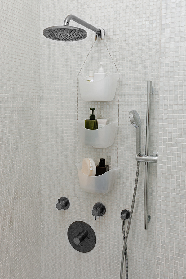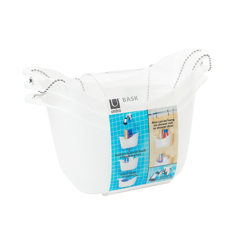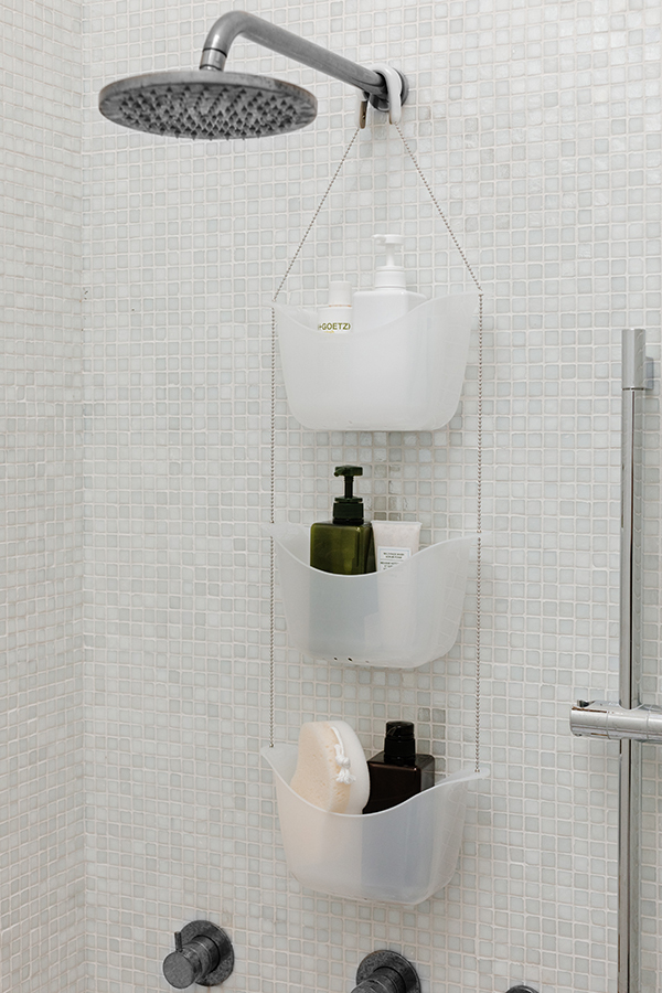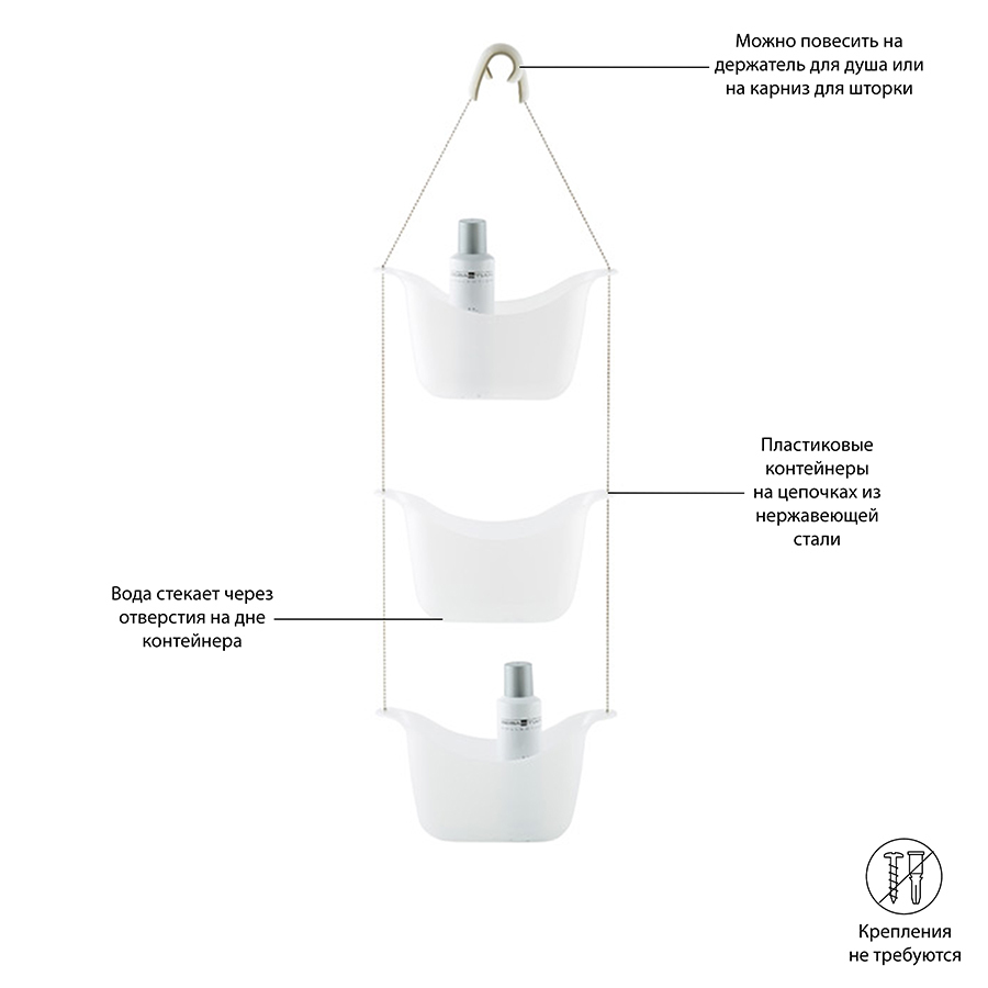 Простая и удобная идея организации всех многочисленных баночек, колбочек и бутылочек с шампунями, гелями для душа, кремами и прочими косметическими принадлежностями. Три корзины, соединенные цепочкой из нержавеющей стали, плюс два специальных крючка, которые позволяют повесить конструкцию на крепление для душа или штангу для шторки в ванной.