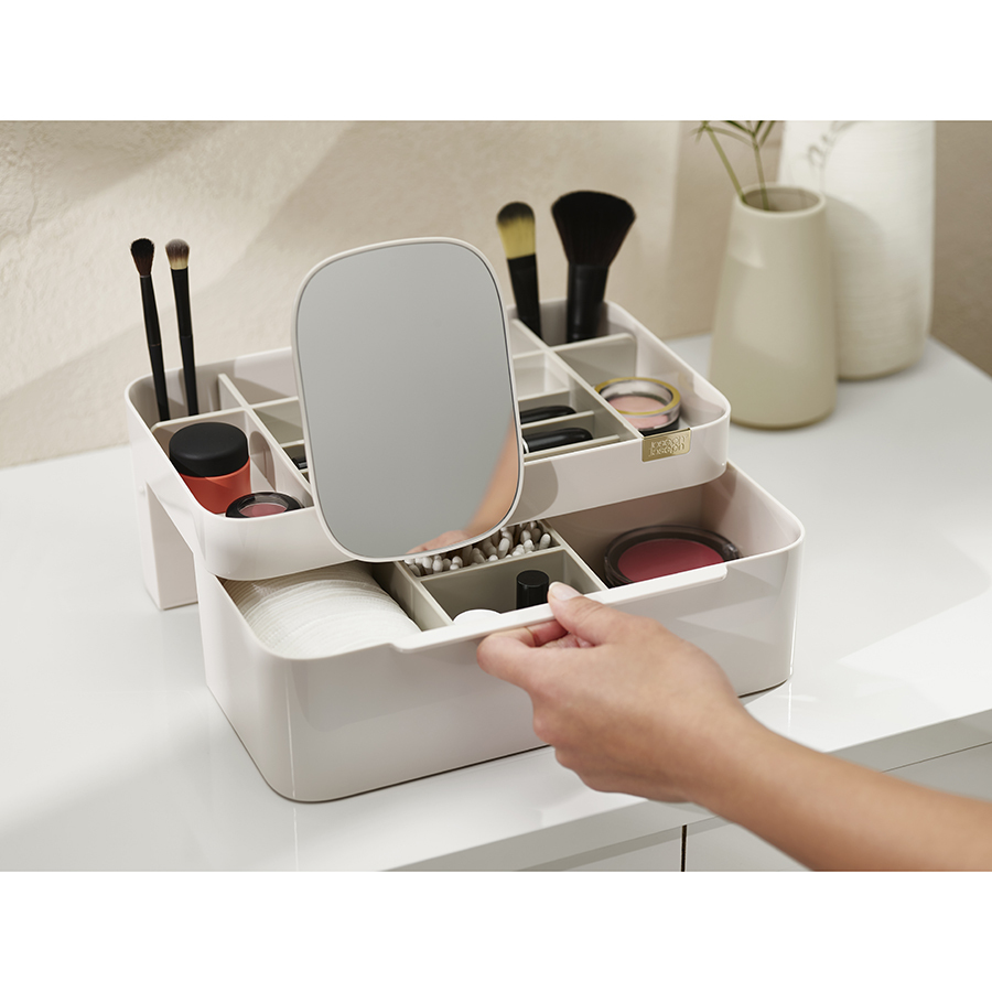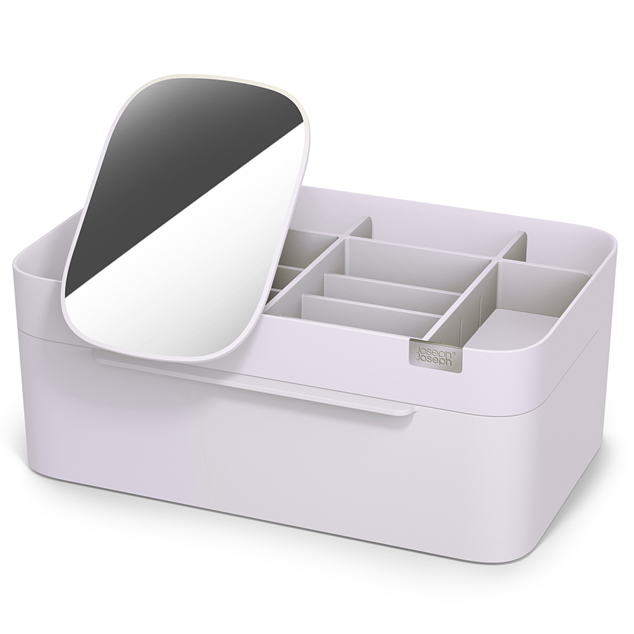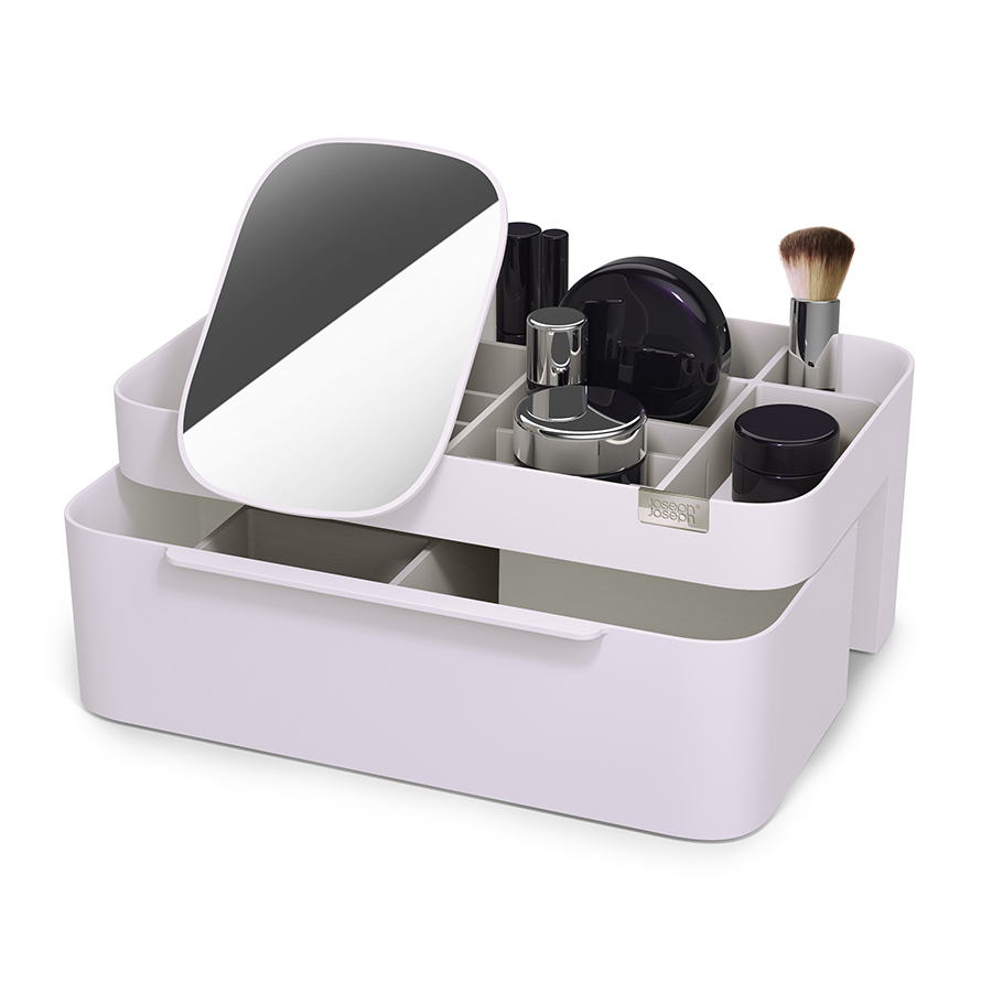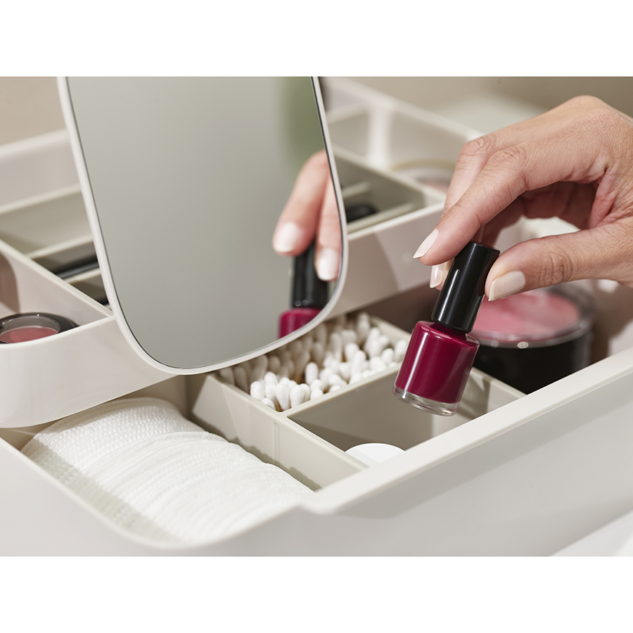 Органайзер включает несколько отделений разной глубины, а также большой ящик и съемное зеркало 2-в-1, которое можно хранить в заднем отсеке или удобно закрепить на бортике. Глубокие отделения подойдут для хранения кистей, туши и карандашей. Отделения меньшей глубины - для таких предметов, как бальзамы для губ, румяна и тени для век. Органайзер легко разбирается для очистки.