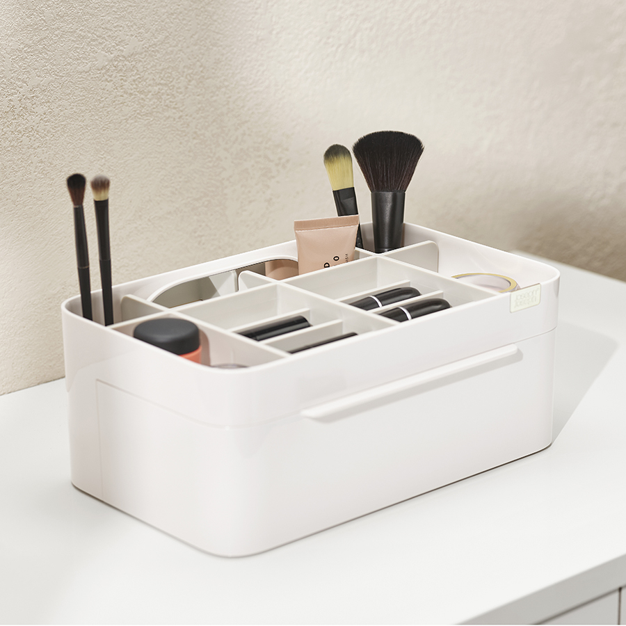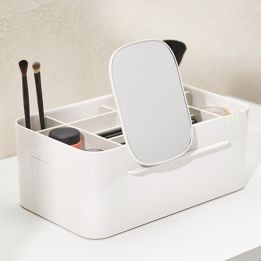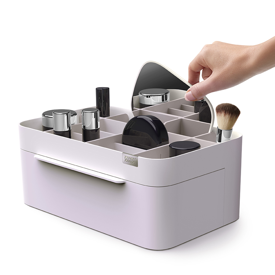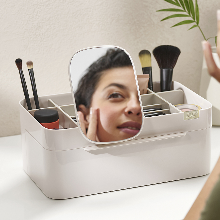 Органайзер включает несколько отделений разной глубины, а также большой ящик и съемное зеркало 2-в-1, которое можно хранить в заднем отсеке или удобно закрепить на бортике. Глубокие отделения подойдут для хранения кистей, туши и карандашей. Отделения меньшей глубины - для таких предметов, как бальзамы для губ, румяна и тени для век. Органайзер легко разбирается для очистки.