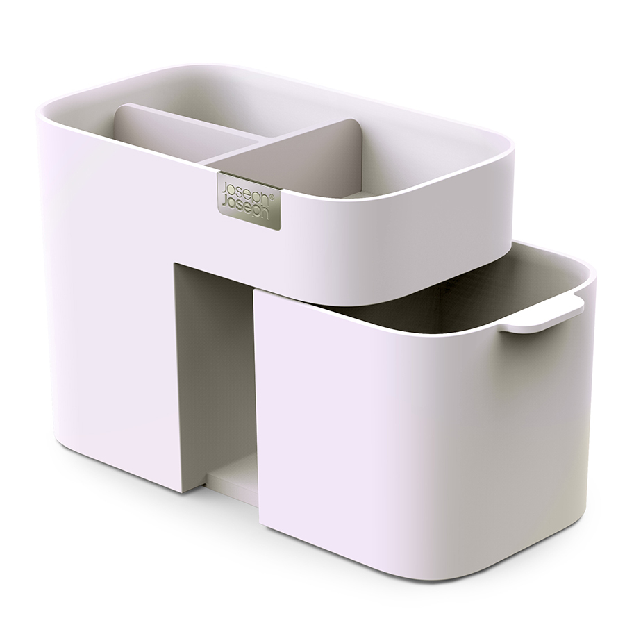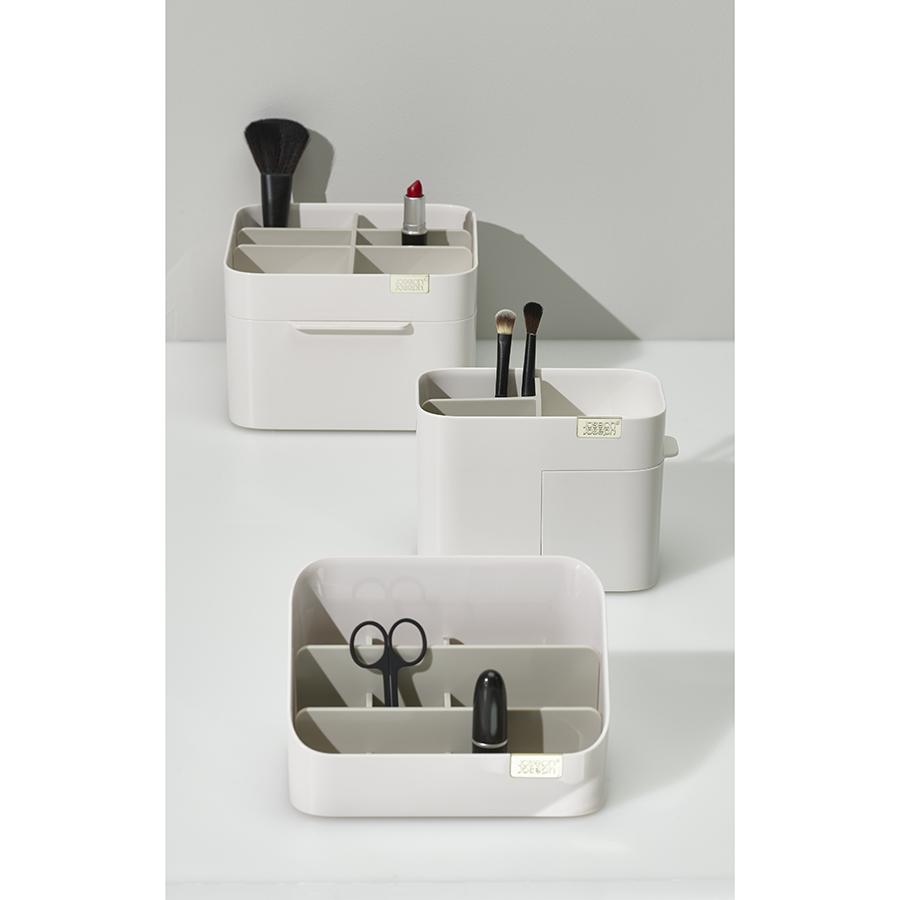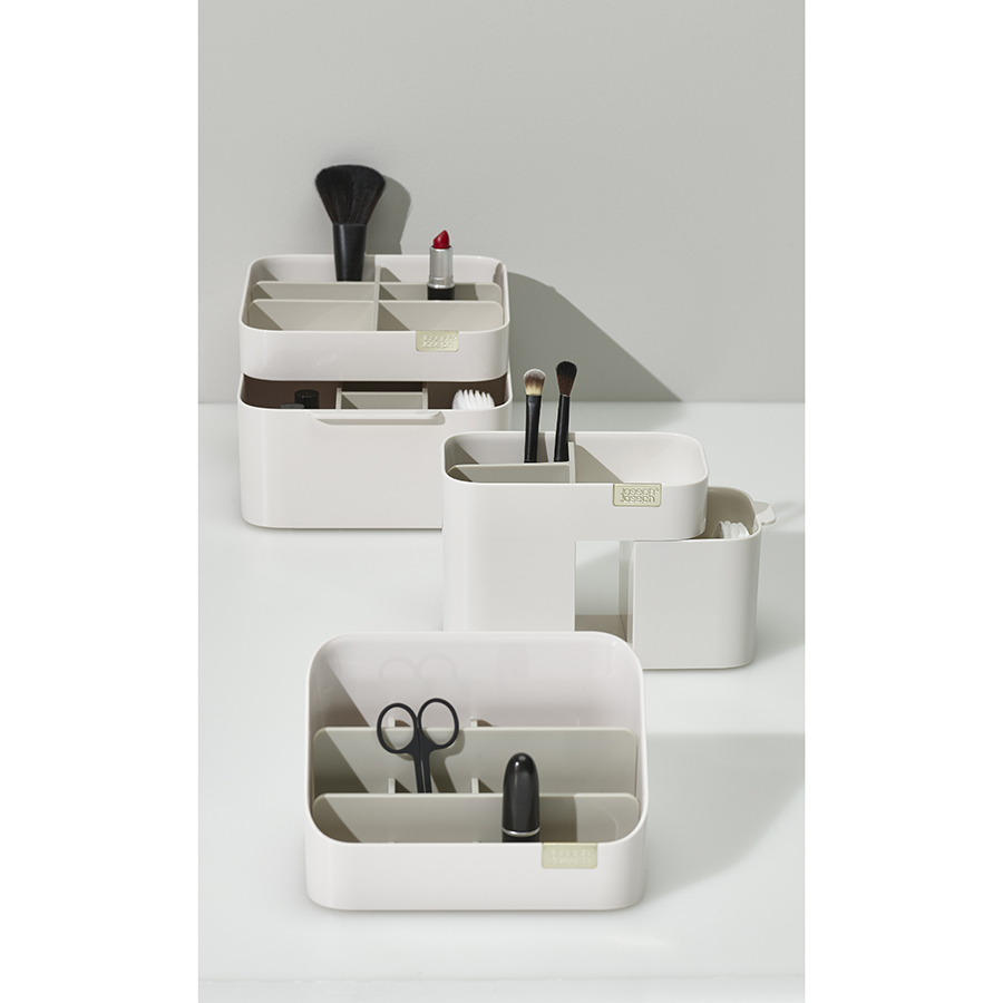 Органайзер включает несколько отделений разной глубины, а также большой ящик. Глубокие отделения подойдут для хранения кистей, туши и карандашей. Отделения меньшей глубины - для таких предметов, как бальзамы для губ, румяна и тени для век. Органайзер легко разбирается для очистки.