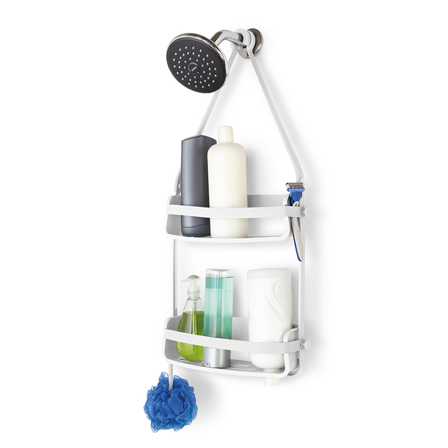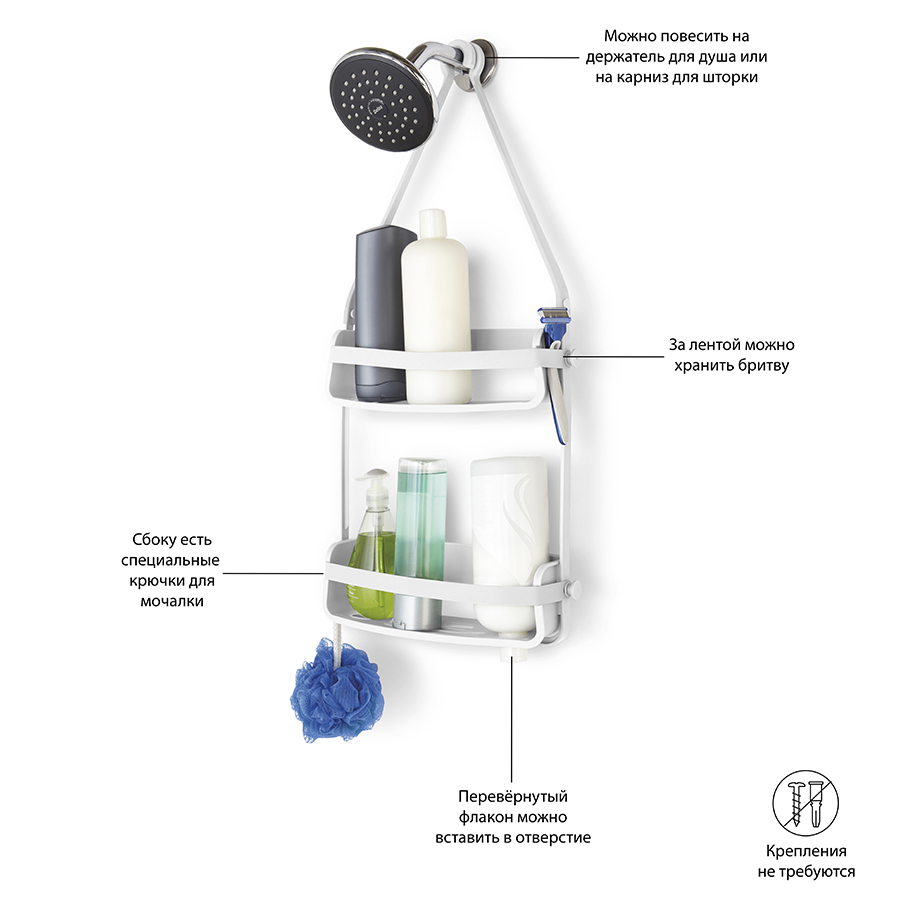 Удобный органайзер, который позволяет разместить максимум предметов на минимальном пространстве. Прочная основа выдерживает до 3,5 кг. В каждой полке предусмотрены отверстия, которые позволяют, перевернув флакон с гелем или шампунем, использовать его как диспенсер. Силиконовые ленты со специальными крючками позволяют повесить органайзер на крепление для душа или на штангу для занавески. Дизайн: Tom Chung