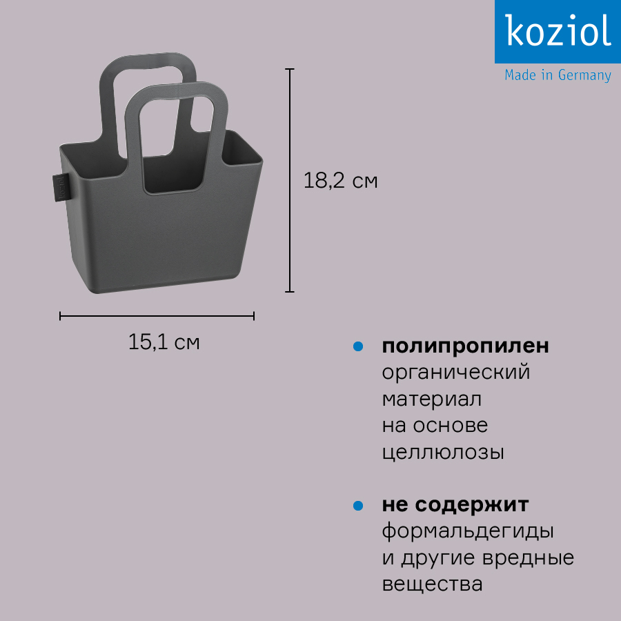 Линейка органайзеров в виде сумок-шопперов была создана дизайнерами бренда Koziol для организации хранения самых разных вещей. В коллекции представлены различные цвета и размеры: Taschelini S (маленький), Taschelino M (средний), и Tasche XL (большой).