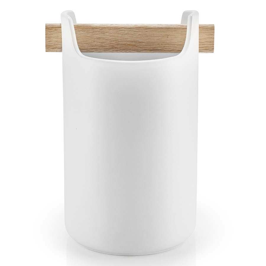 Органайзер – один из самых необходимых предметов на кухне. Он не даёт беспорядку распространяться и экономит время, которое часто тратиться на поиски нужной вещи. Органайзер Eva Solo из белоснежной керамики с ручкой их натурального дуба, которая также выполняет функцию разделителя, создающего внутри две секции для хранения. Внешний вид органайзера напоминает ящик с инструментами, только более рафинированную его версию. Он будет также уместно смотреться на рабочем столе или в ванной: сложите туда кисти для рисования, щётки и губки, карандаши и ножницы или косметические кисти и тюбики с кремом. Высота 20 см