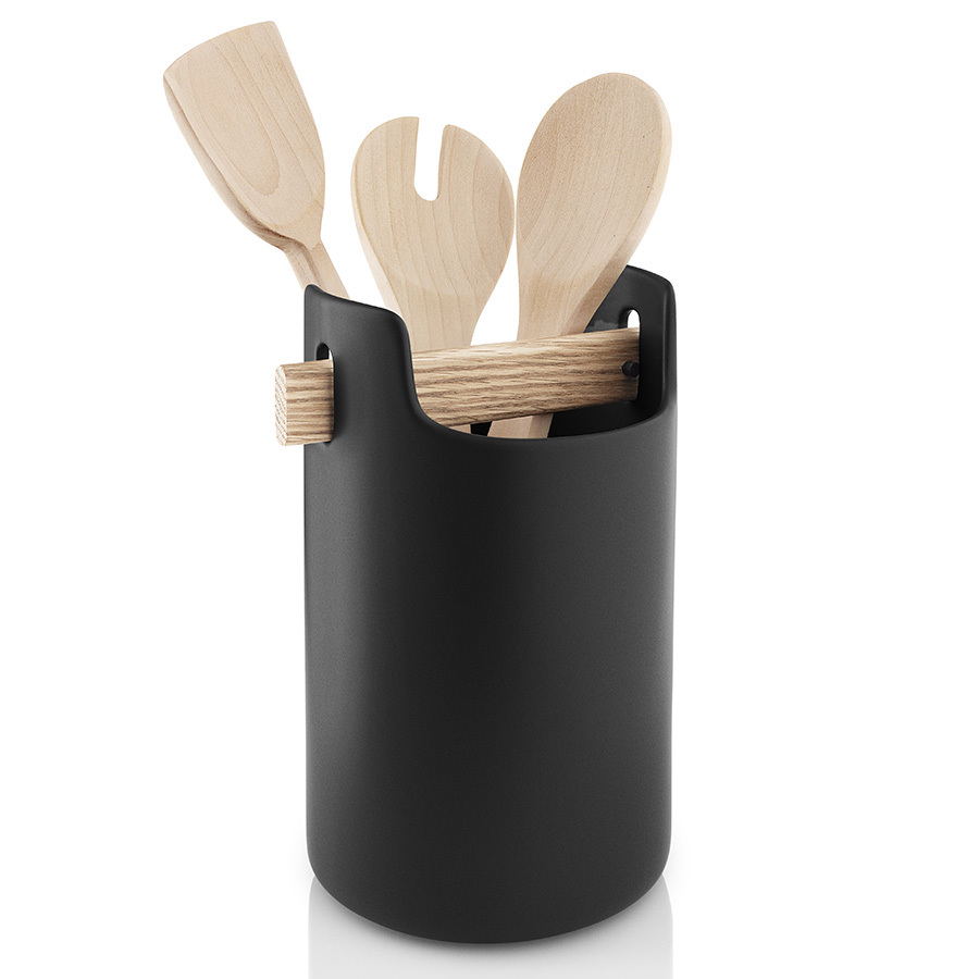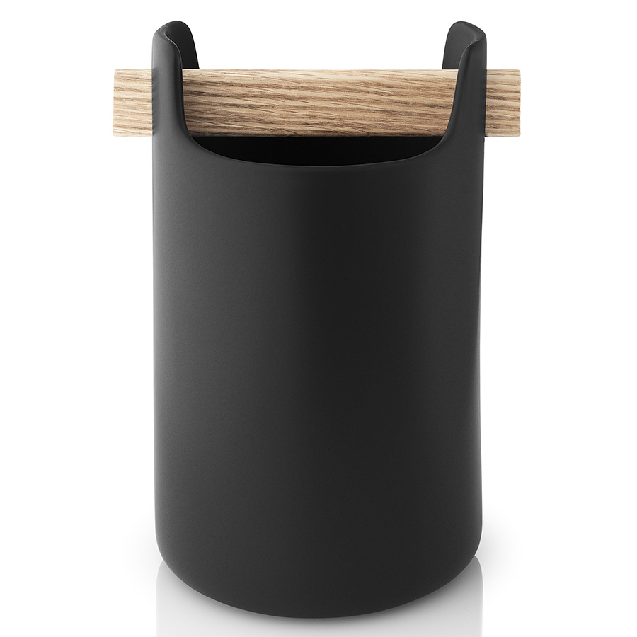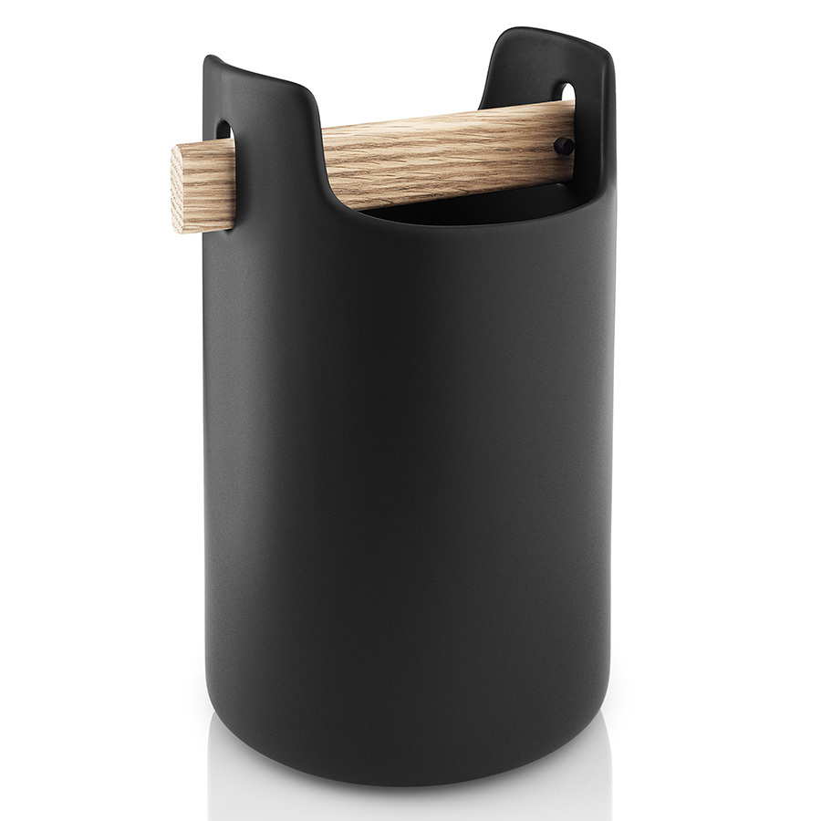 При создании аксессуара мастера Eva Solo используют керамику, которая отличается прочностью и износостойкостью. Органайзер дополнен ручкой из натурального дуба, которая также выполняет функцию разделителя, создающего внутри две секции для хранения.