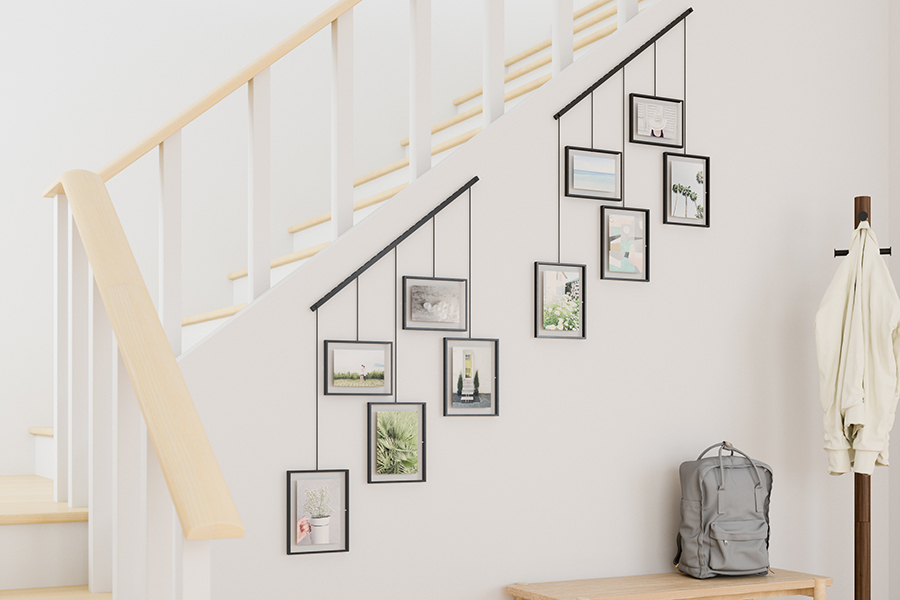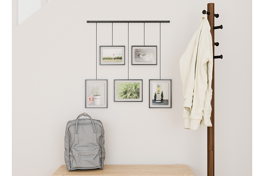 Панно Exhibit – прекрасный способ освежить интерьер и создать в помещении уютную атмосферу. Конструкция имеет вид горизонтальной планки, к которой подвешены фоторамки разных размеров, удерживаемые при помощи специальных зажимов. Возможность чередования изображений с альбомной и портретной ориентацией позволяет проявлять фантазию и создавать свои уникальные сюжеты из фотографий, открыток, писем и любых других предметов. Такой оригинальный коллаж отлично смотрится на стене в любой из комнат, а также подходит для украшения лестничного пролета. Для установки панно потребуется просверлить в стене всего два отверстия.