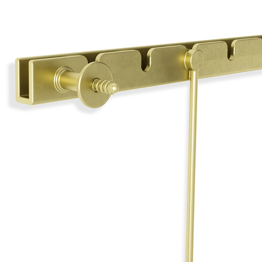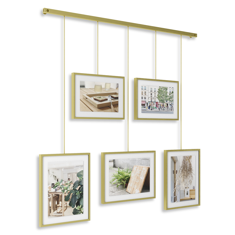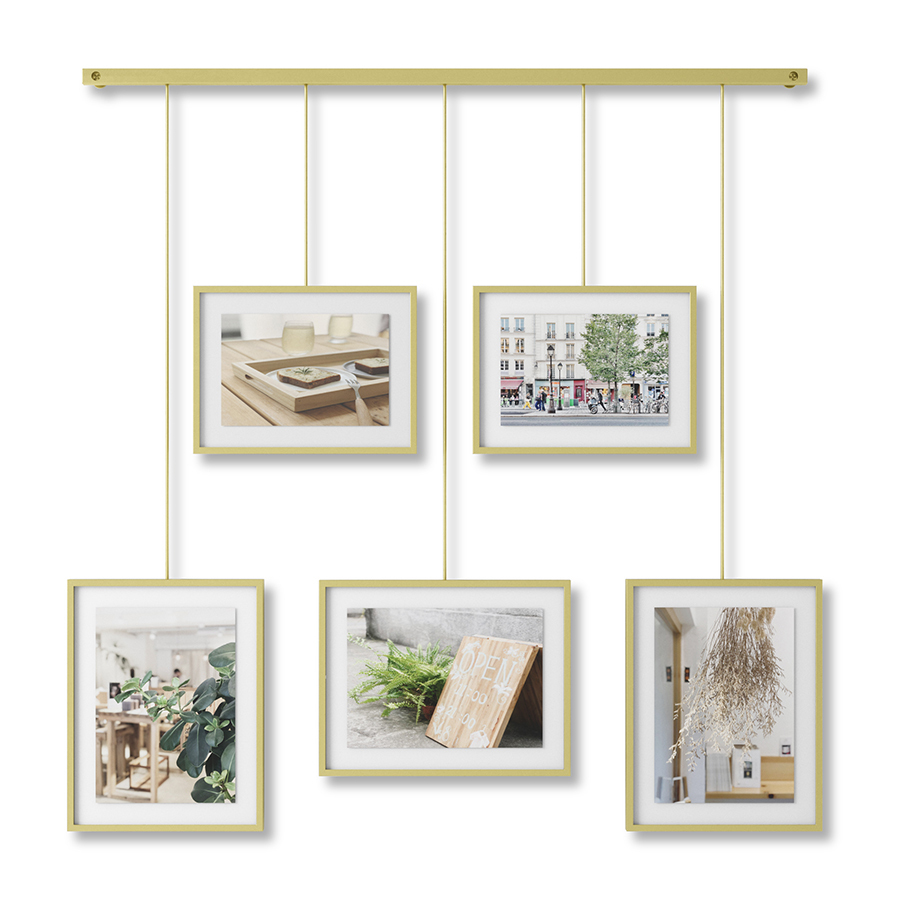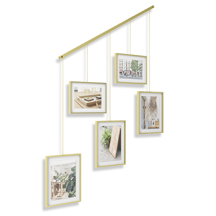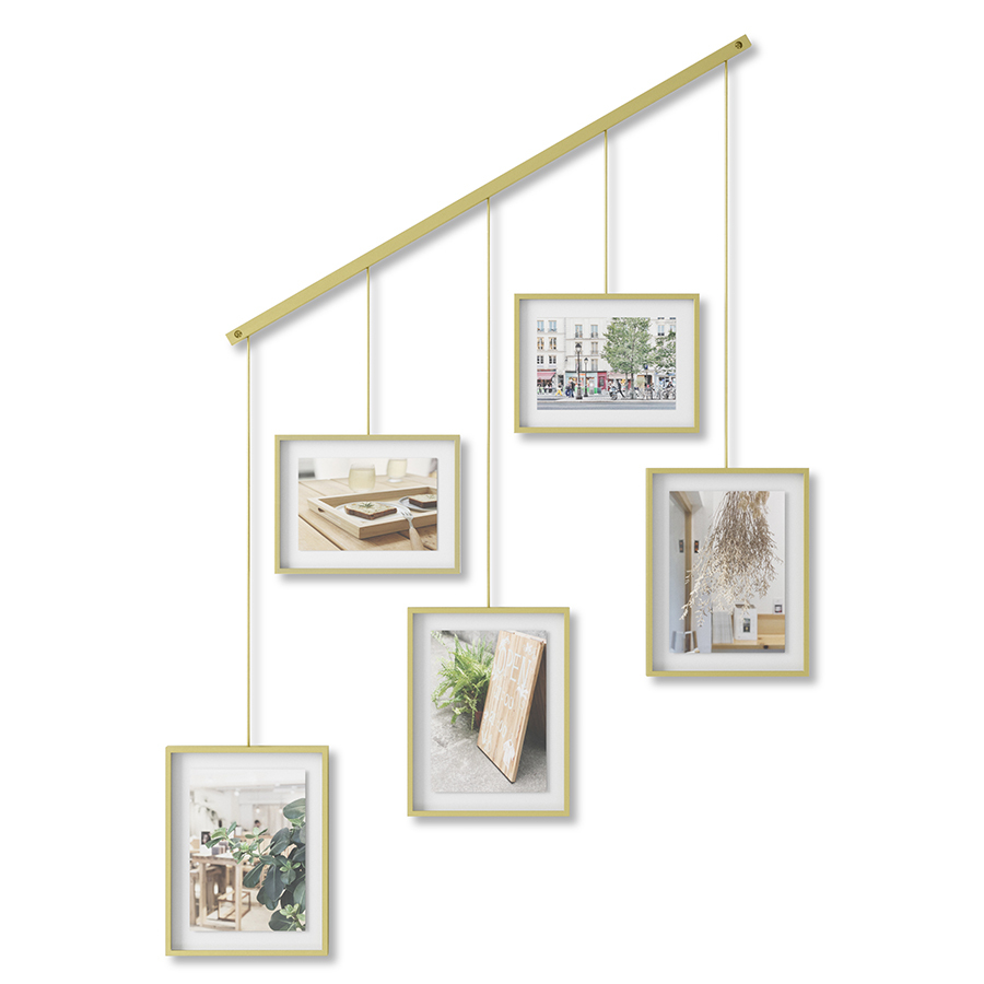 Дисплей состоит из 5 рамок, смонтированных по горизонтали под разным углом. Рамки выполнены из стали и покрыты черной порошковой краской. Каждый снимок или картинка прячется под стеклом. Все рамы зафиксированы на единой планке с помощью зажимов. Основание крепится к стене на шурупы и дюбели, которые входят в комплект.
