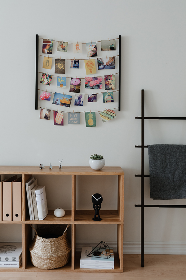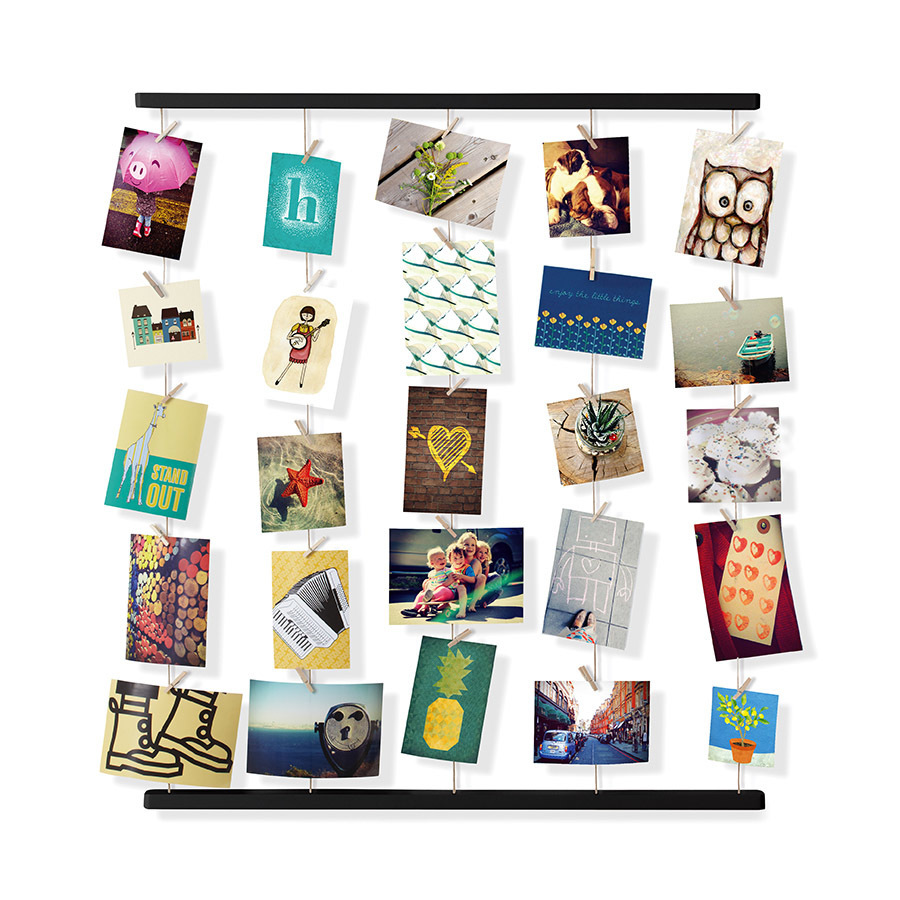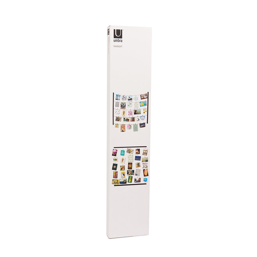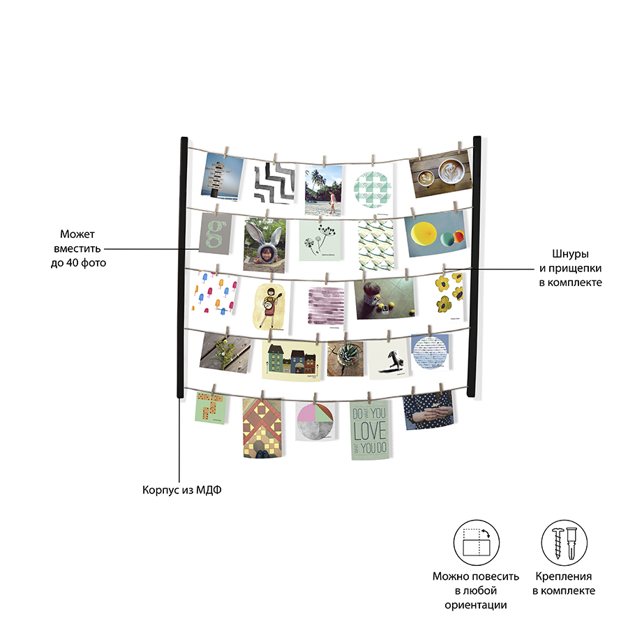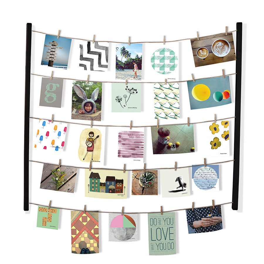 Решение для создания композиций из большого количества фотографий. Снимки, открытки, детские рисунки, письма и т. д. крепятся на 5 нитях, имитирующих бельевую верёвку. 40 деревянных прищепок идут в комплекте. Композицию легко менять под настроение. Может крепиться как вертикально, так и горизонтально. Дизайн: Sung wook Park & Paul Loebach