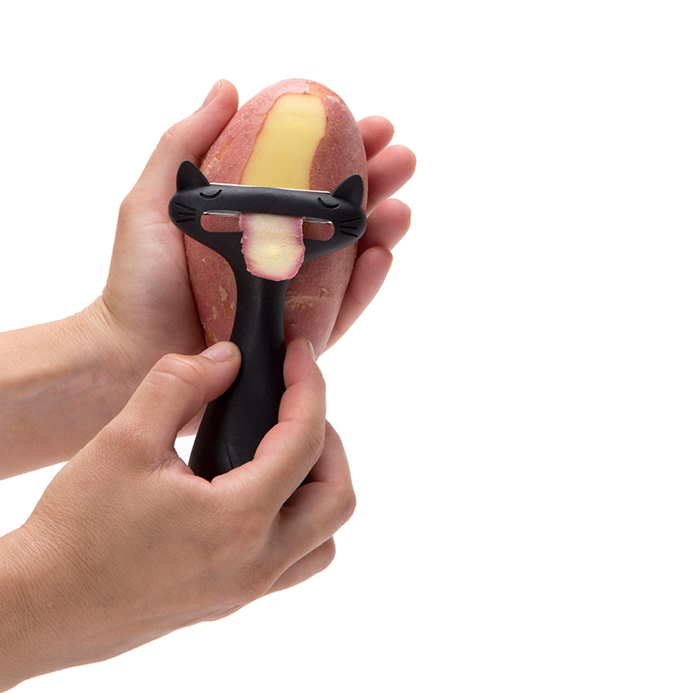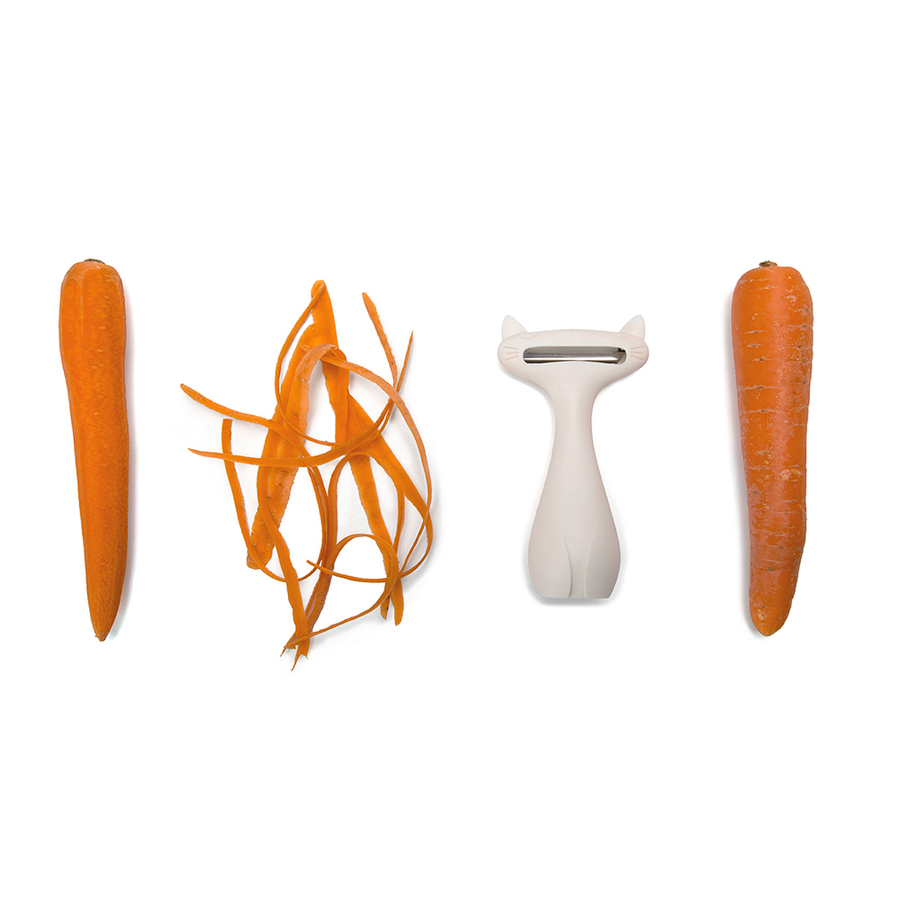 Пиллер для овощей позволяет сэкономить время в процессе приготовления пищи. Нож с острыми зазубринами с двух сторон имеет плавающее основание. Благодаря такой конструкции удобно снимать даже тонкую кожуру, например, с перца или помидор. Пиллер выполнен в форме кота, - широкое туловище-основание не дает руке скользить во время работы, а заостренные уши позволяют удалять мелкие повреждения на овощах. С помощью ножа также удобно шинковать капусту и делать нарезку в виде тонких полосок. Округлая верхняя часть корпуса защищает руки от случайного травмирования. Пиллер можно мыть в посудомоечной машине.
