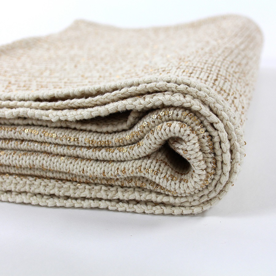 Мягкий плед из 100% чесаного хлопка высшей категории с добавлением золотой нити из люрекса. Благодаря самому высокому сорту хлопка изделие мягкое, воздушное, волокно износостойкое. Добавленная золотая нить создает праздничное настроение. Таким пледом приятно укрыться в холодные зимние вечера, окружив себя настоящей мягкостью и комфортом. Изготовлено на фабрике, работающей с лучшими брендами Европы и США.