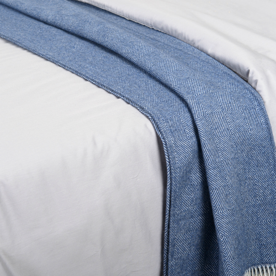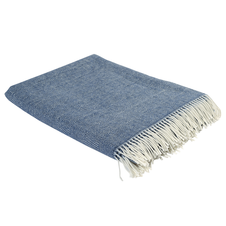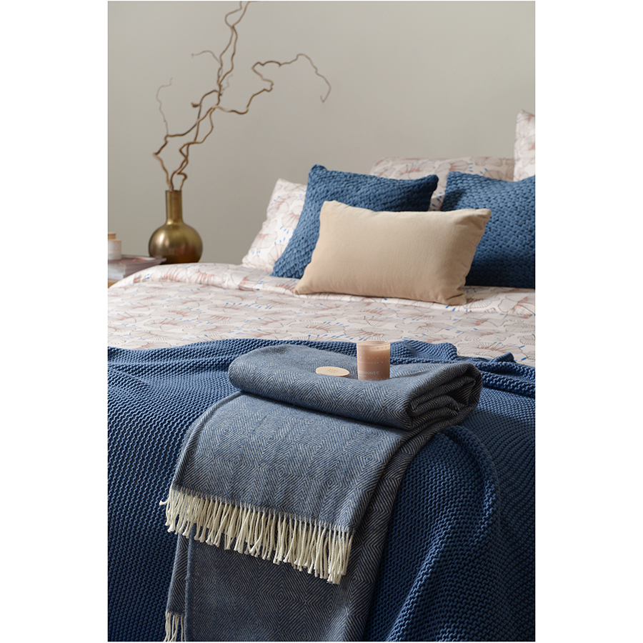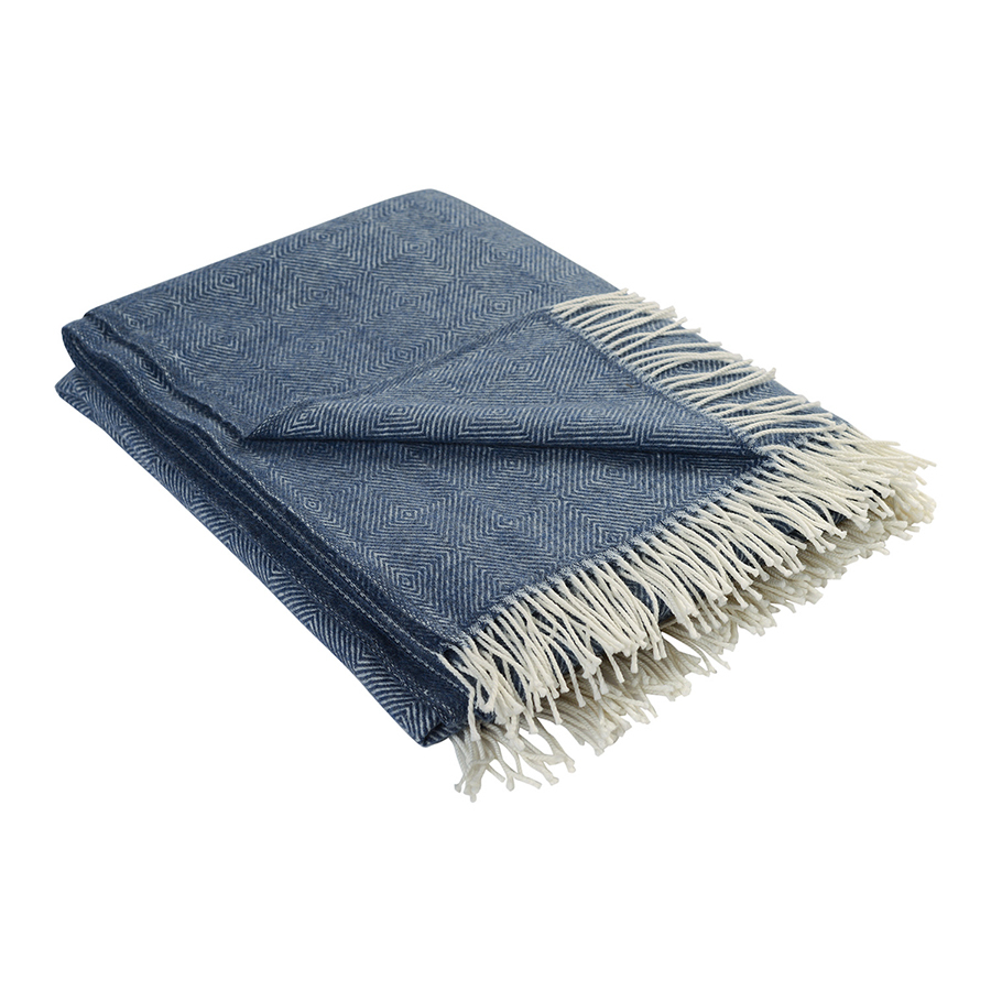 Синий плед с белоснежной бахромой по краям украсили фактурным микроузором. Приятный на ощупь аксессуар выполнен из тонкой и при этом теплой шерсти мериноса. Такой материал мягче натурального шелка и в несколько раз эластичнее хлопка. Изделие упаковано в крафтовую коробку.