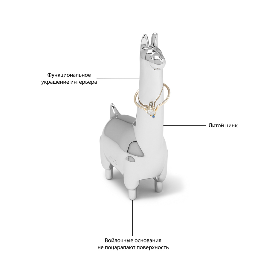 Подставка для колец Zoola Лама – стильный и функциональный держатель для украшений от Umbra. Изделие с хромированным покрытием предназначено как для хранения ювелирных изделий, так и общего декора интерьера комнаты. Шея ламы - импровизированная вешалка для колец и перстней. Нижняя часть подставки снабжена мягкой подкладкой, чтобы не царапать поверхность мебели. Теперь ваши украшения всегда будут на своем месте, а не разбросаны по квартире.