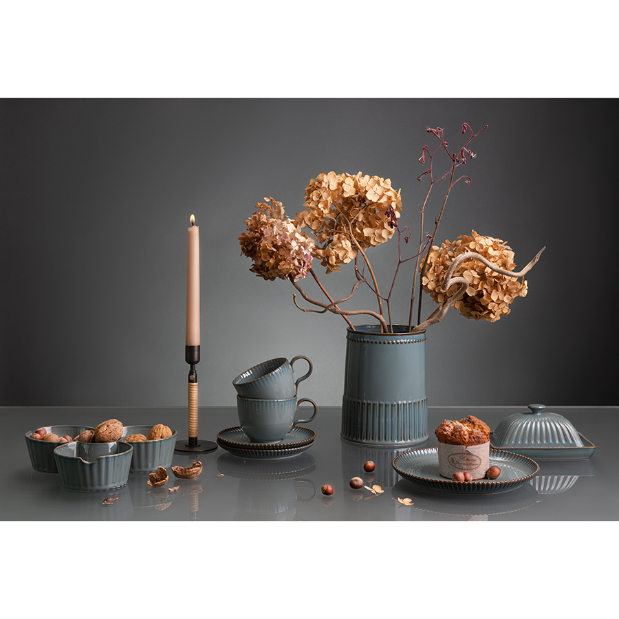 Отличительной особенностью линейки является покрытие из реактивной глазури, которое создает на поверхности посуды уникальные узоры. Во время обжига фарфора возникает химическая реакция, обычно плавление или окисление, в результате которой и получается нужный рисунок. Благодаря такой обработке найти два идентичных изделия практически невозможно. Именно за счет своей индивидуальности и неповторимости узора столовая посуда и аксессуары для сервировки с реактивной глазурью стали трендом в мире дизайна и декора.