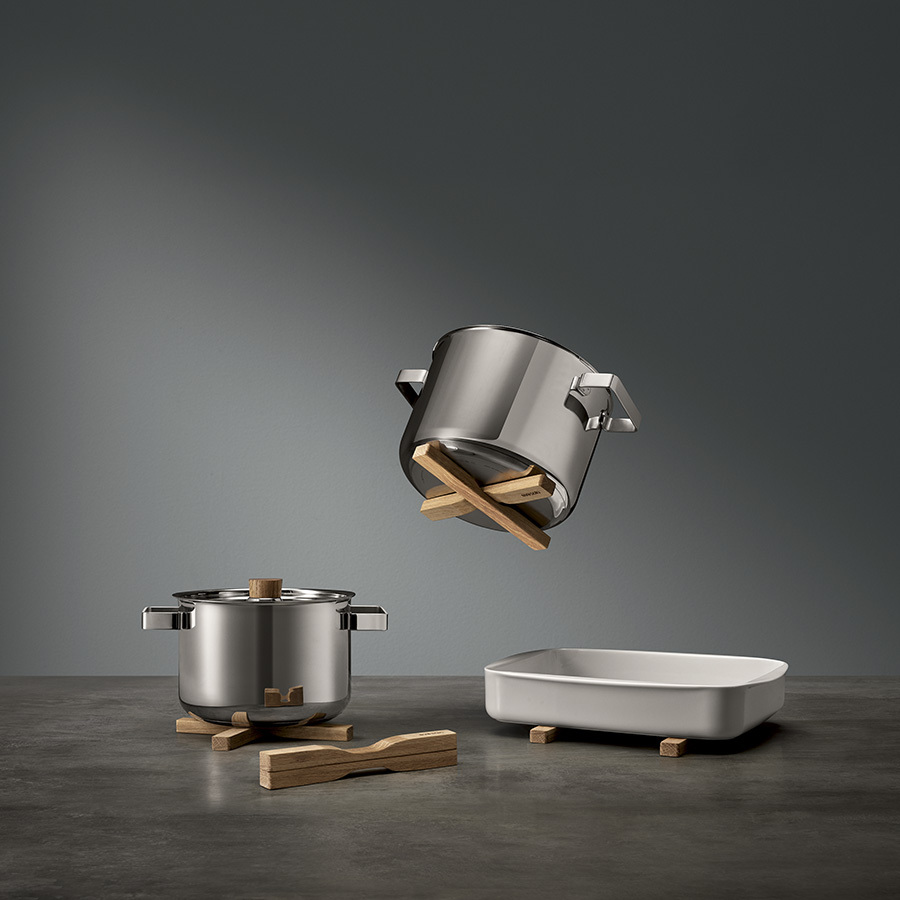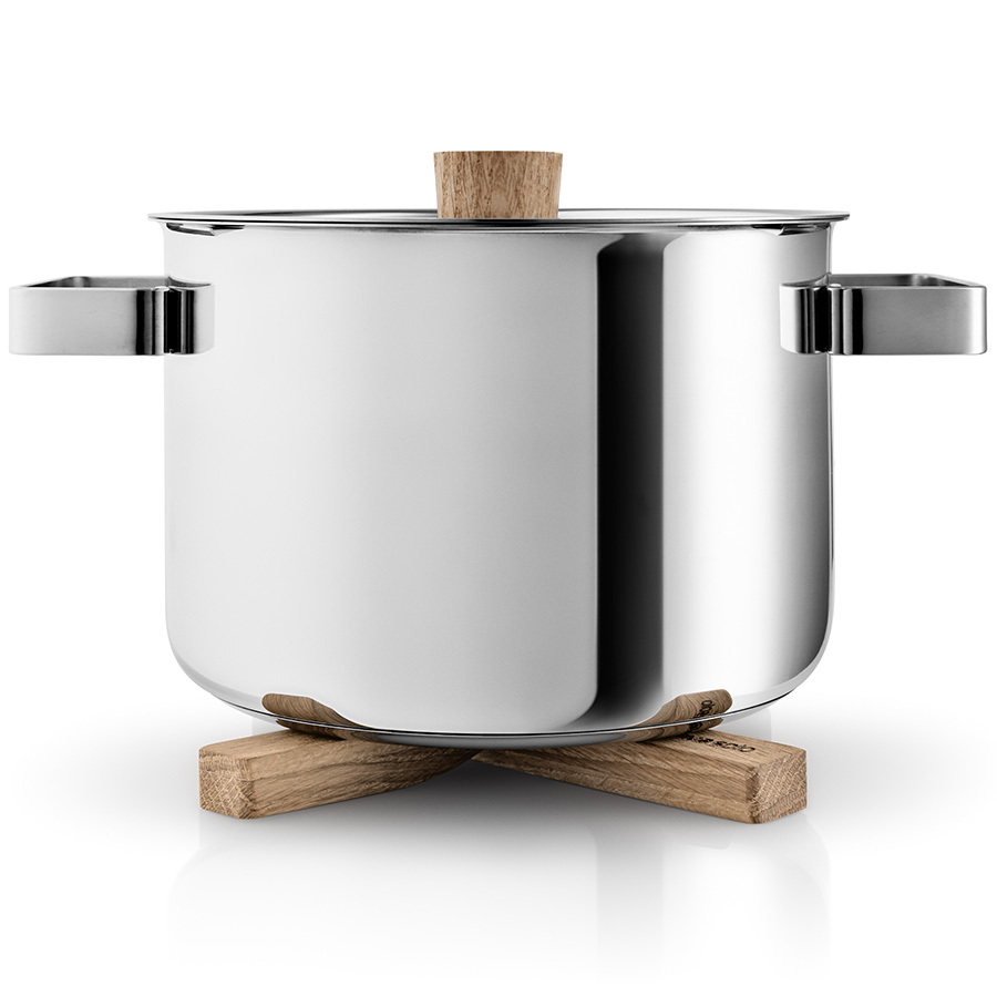 Для использования с большими блюдами, а также для компактного хранения подставка легко разбирается на две части. Благодаря встроенным магнитам аксессуар перемещается по столу вместе с металлической посудой. Подставка изготовлена из натурального дуба.