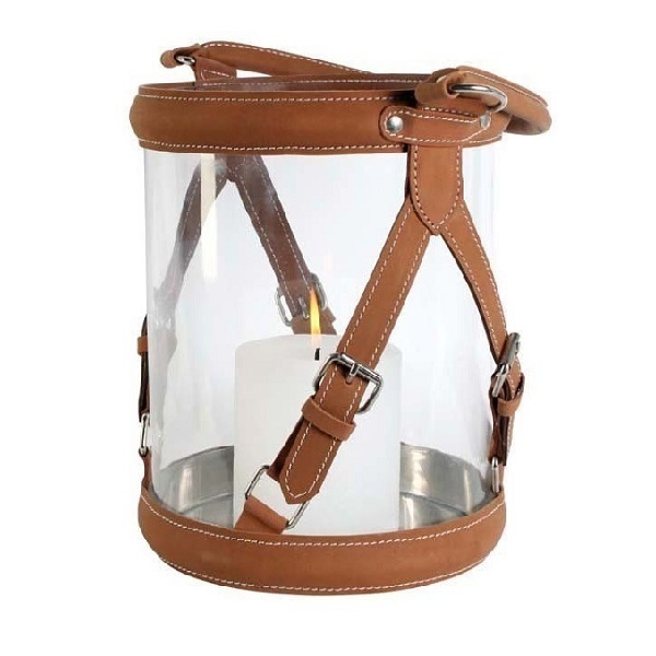 Подсвечник в современном стиле. Выполнен в виде банки из прозрачного стекла с элементами из коричневой натуральной кожи.