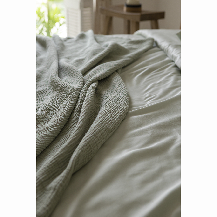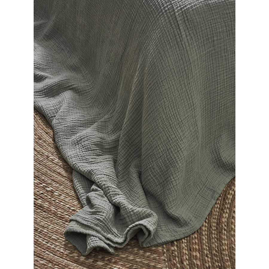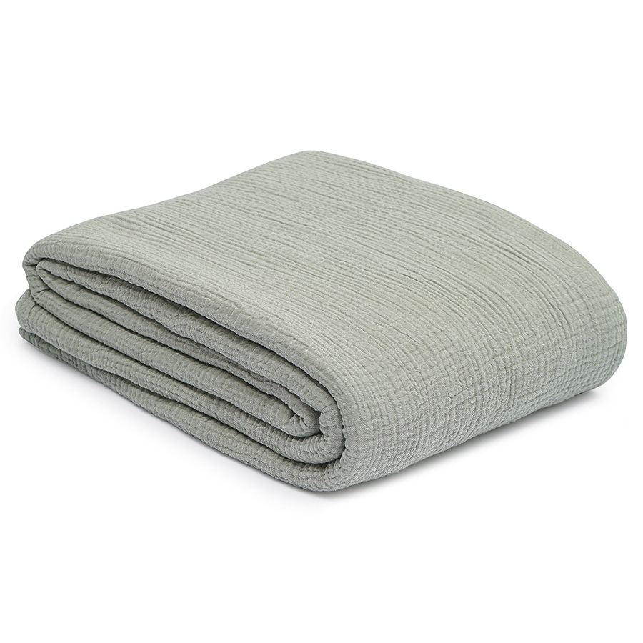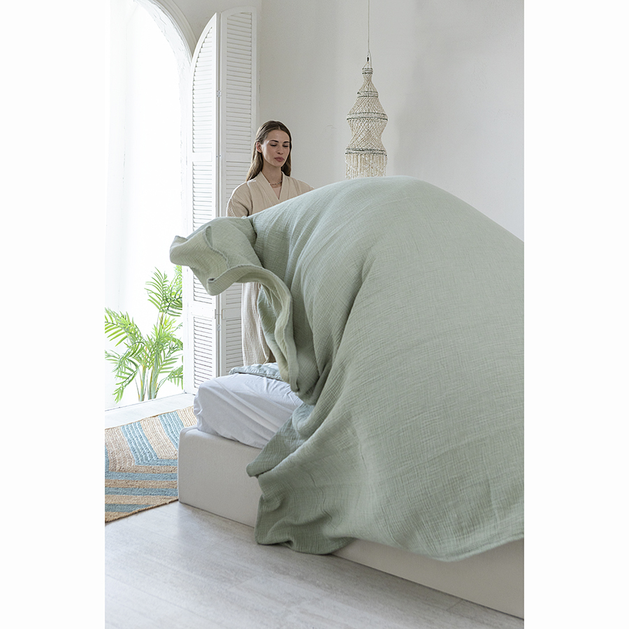 Покрывало двухсторонее из многослойного муслина травянисто-зеленого цвета из коллекции Essential сделает интерьер спальни уютным и подарит чувство комфорта при использовании. Легкий, дышащий материал на основе экологичного хлопкового волокна приятный на ощупь, хорошо впитывает влагу, не электризуется и не вызывает аллергию. За счет специального переплетения нитей в каждом из четырех слоев ткань имеет интересную фактуру, обладает высокой плотностью, устойчивостью к износу, не скатывается и хорошо держит форму. Элегантная простота муслинового покрывала позволяет вписать его в различные стилевые решения интерьера: сканди, кантри, прованс, эклектика, бохо, эко, минимализм и другие.