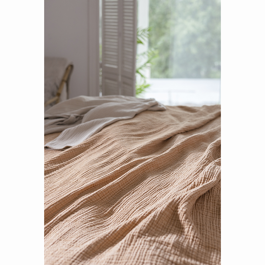 Покрывало двухсторонее из многослойного муслина цвета охры из коллекции Essential сделает интерьер спальни уютным и подарит чувство комфорта при использовании. Легкий, дышащий материал на основе экологичного хлопкового волокна приятный на ощупь, хорошо впитывает влагу, не электризуется и не вызывает аллергию. За счет специального переплетения нитей в каждом из четырех слоев ткань имеет интересную фактуру, обладает высокой плотностью, устойчивостью к износу, не скатывается и хорошо держит форму. Элегантная простота муслинового покрывала позволяет вписать его в различные стилевые решения интерьера: сканди, кантри, прованс, эклектика, бохо, эко, минимализм и другие.