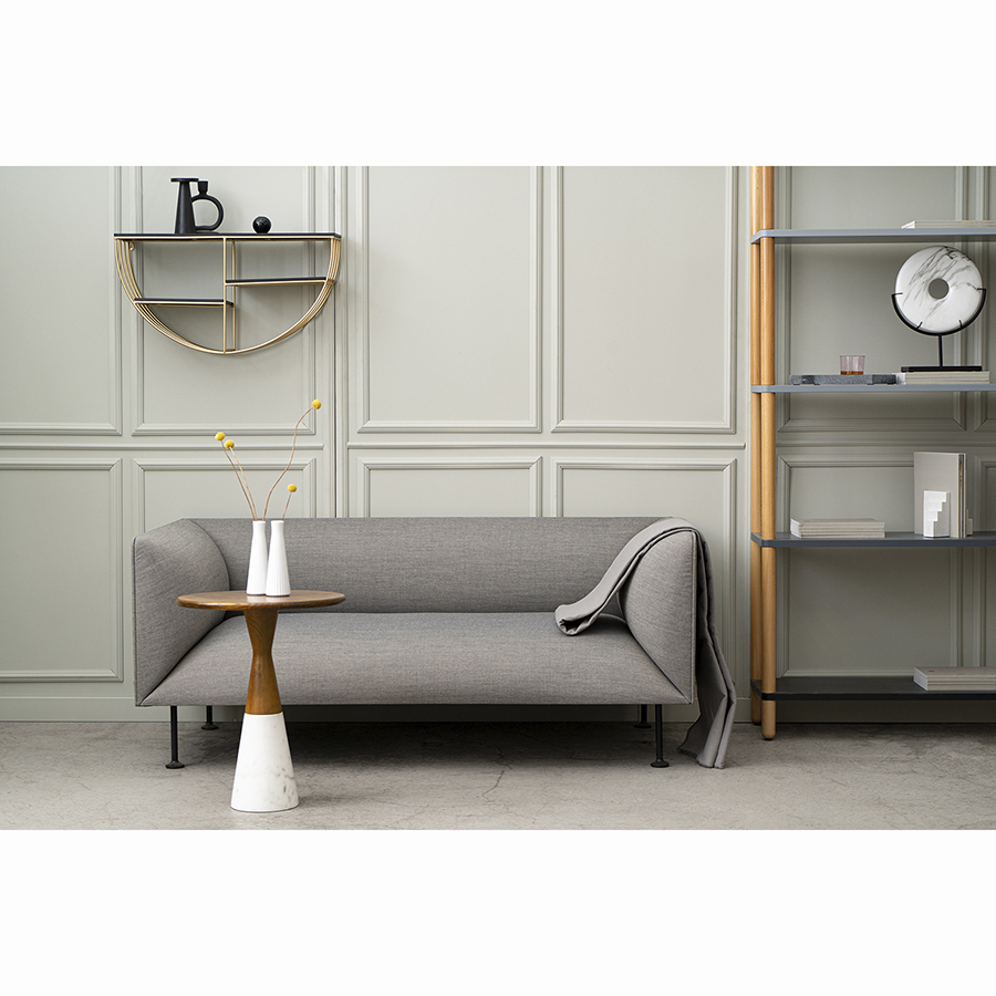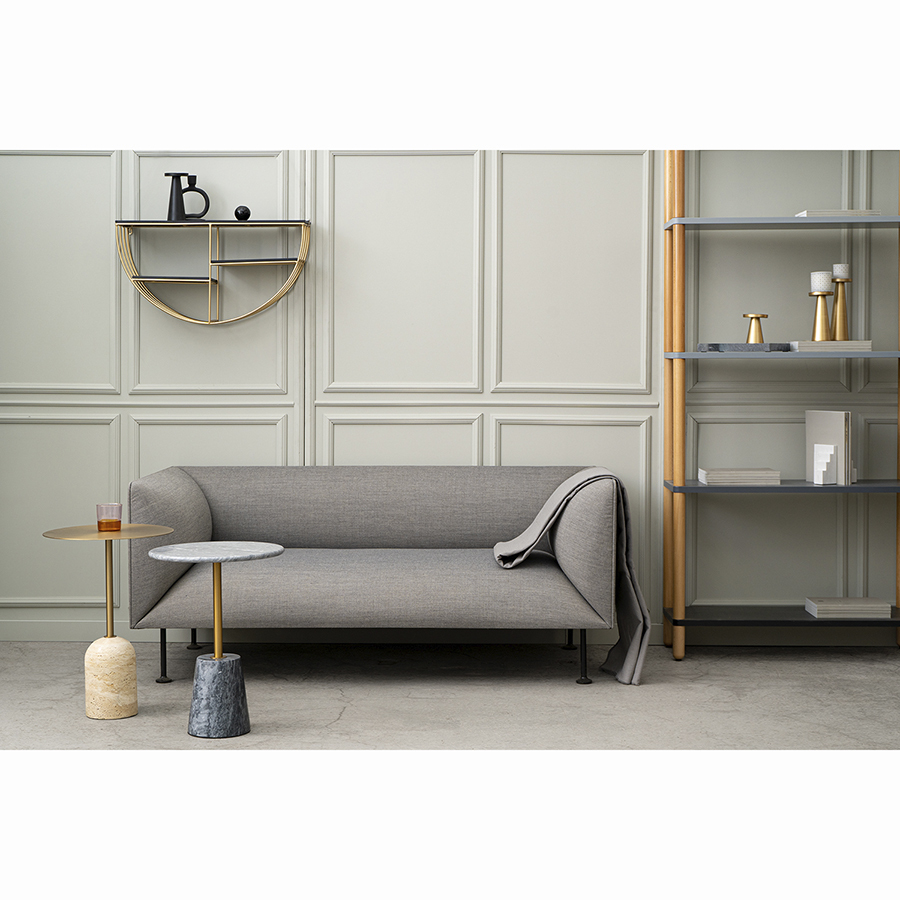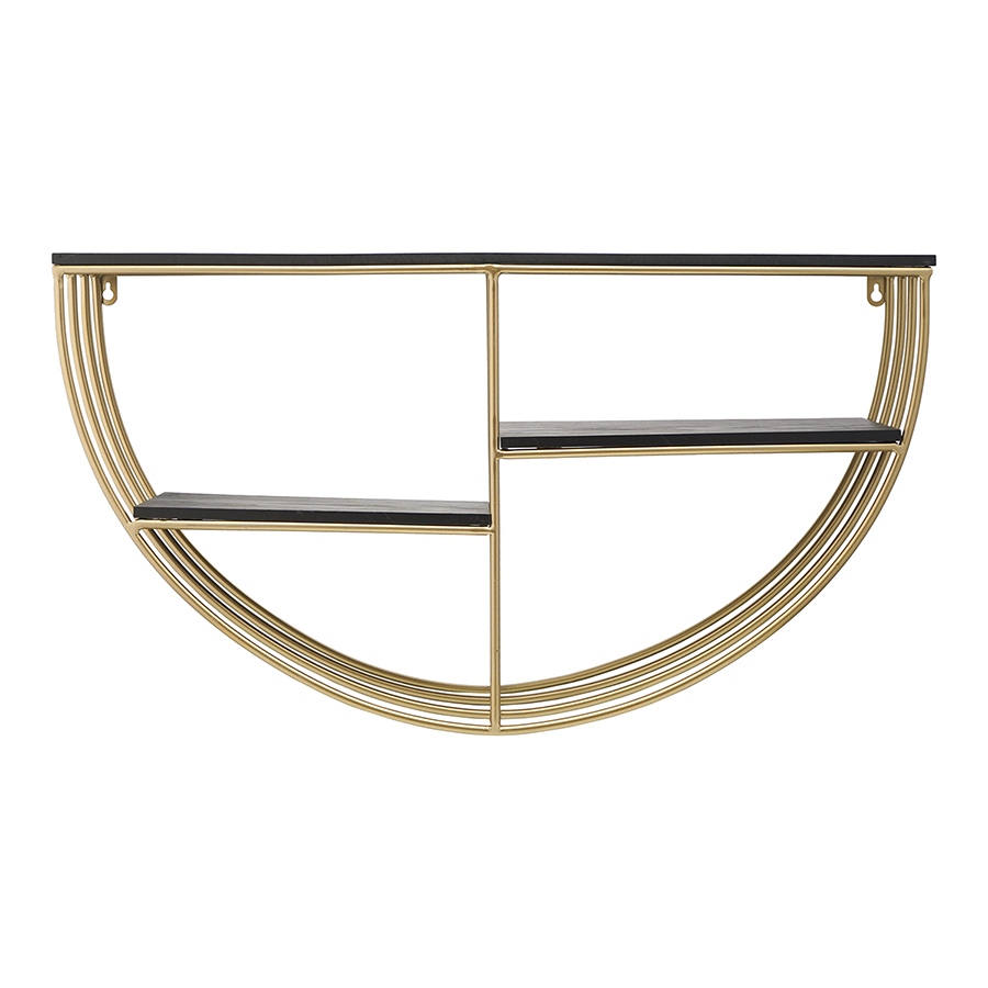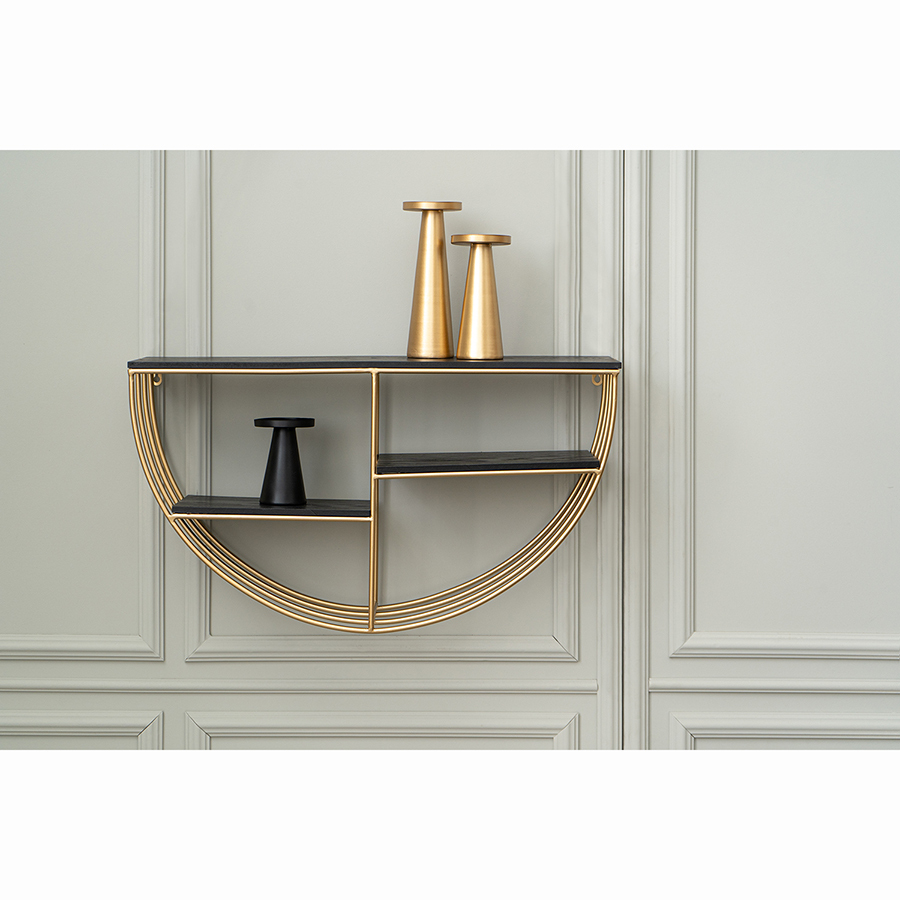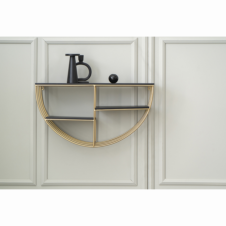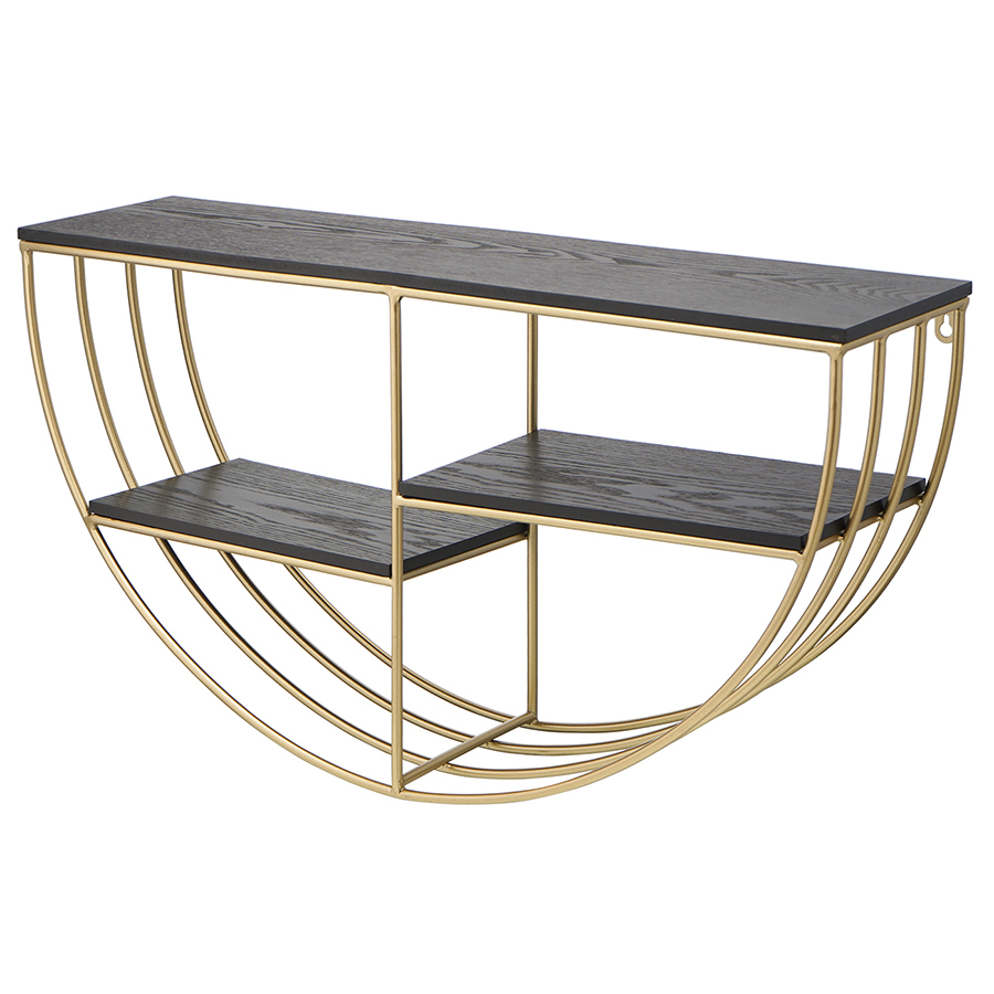 Конструкция имеет железный каркас, что делает ее практичной, надежной и долговечной. Трехъярусная модель дает возможность разместить в одном месте больше предметов. Пространства для хранения выполнены из МДФ – прочного, влагостойкого материала. Необычные геометрические формы обеспечивают в интерьере красивый визуальный эффект, а элементы теплого оттенка латуни добавляют в оформление нотки уюта и благородства.
