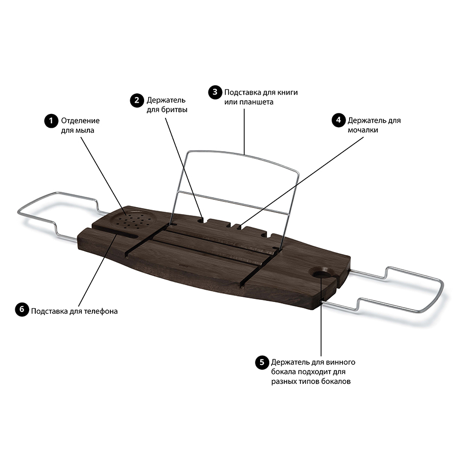 Полка оснащена встроенной мыльницей, прорезью для бокала с вином, подставкой для книги или iPad, отверстием для телефона и держателем для бритвенного станка. Аксессуар выполнен из экологически чистого бамбука, который отличается стойкостью к повышенной влажности. Благодаря выдвижным хромированным кронштейнам полку можно устанавливать на любую ванную шириной до 94 см.