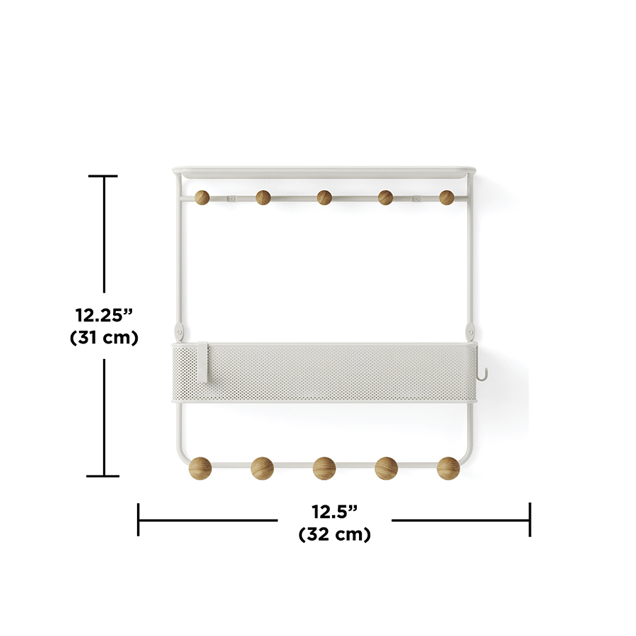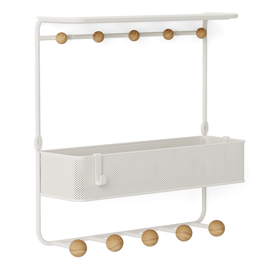 Полка Estique поможет создать дополнительное, легкодоступное пространство для хранения вещей в любой комнате. Модель оснащена перфорированной металлической корзиной и десятью крючками с наконечниками из буковой древесины, что делает ее эргономичной и вместительной. В ванной такую полку можно использовать для размещения бытовой химии, косметических средств, банных принадлежностей и прочего. Для прихожей эта настенная конструкция станет удобной вешалкой для головных уборов, сумок, курток и местом для хранения почты. Прочное, устойчивое к коррозии стальное основание обеспечивает изделию надежность и долговечность. Сочетание дерева и металла органично вписывается в различные стилевые решения интерьера.