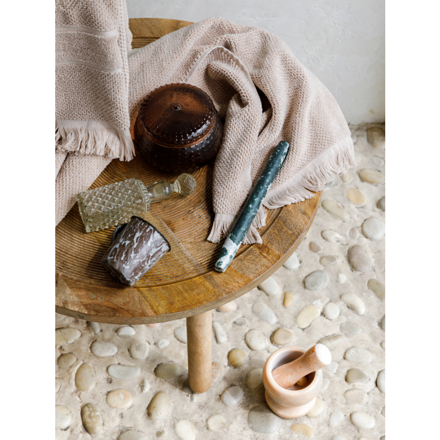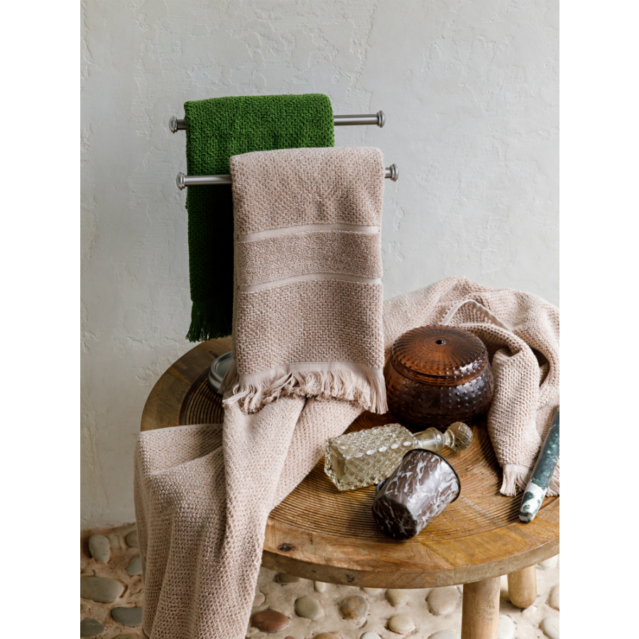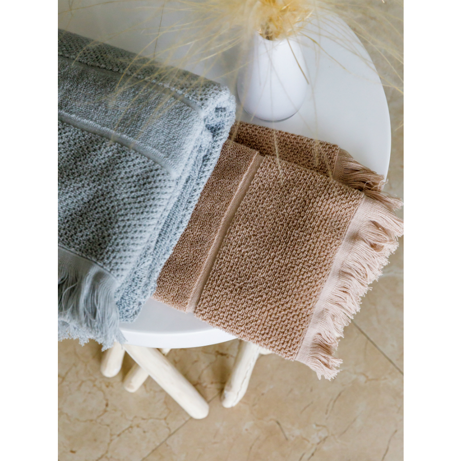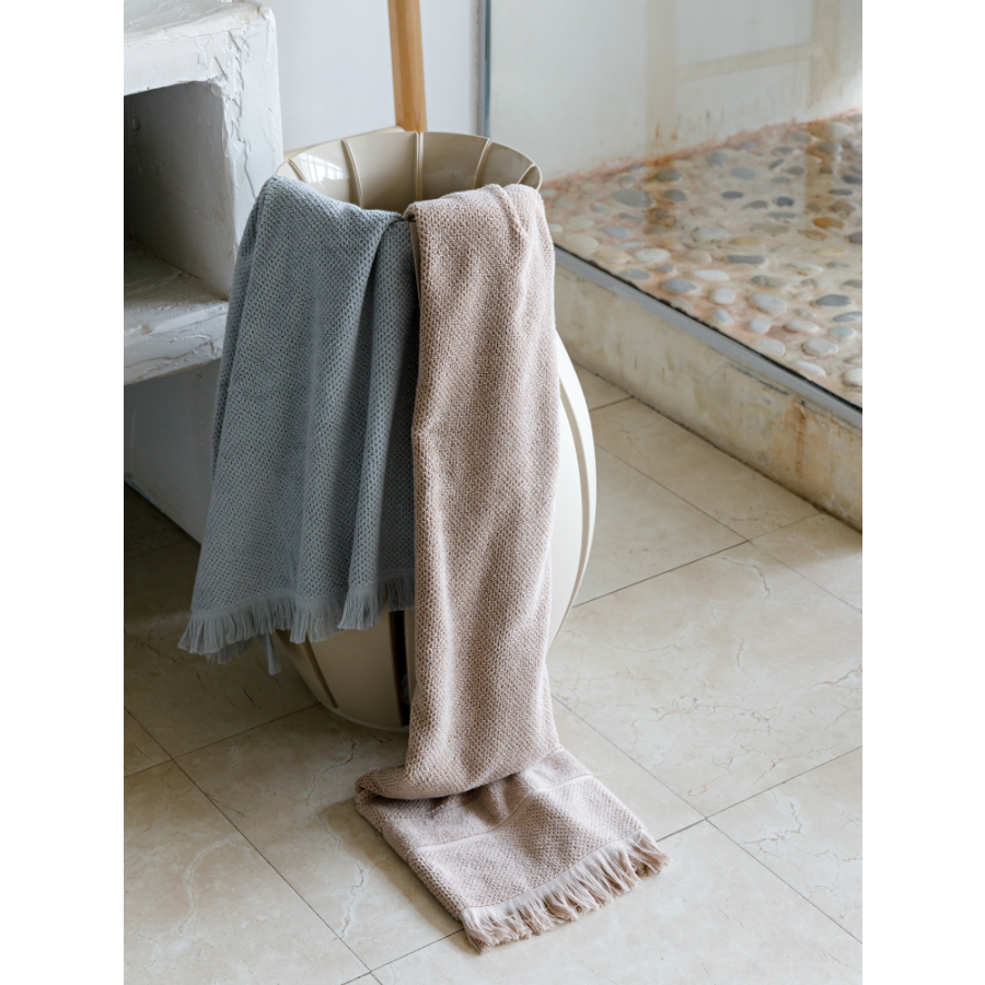 Полотенце линии Essential украшено фактурным узором и мягкой бахромой в тон. За счет такого дизайна аксессуар органично подчеркнет любой интерьер ванной комнаты. Изделие станет отличной находкой для тех, кто любит качественные банные принадлежности из натуральных тканей. Ровная прочная пряжа изготавливается из лучших сортов длинноволокнистого хлопка методом тщательного прочесывания материала, что значительно улучшает ее качественные характеристики. Полотенце быстро впитывает влагу, оставляя приятное ощущение свежести и чистоты. Изделие отличается особенной износостойкостью: оно хорошо держит форму и сохраняет впитывающие свойства на протяжении долгого времени. Плотность ткани - 514GSM. Размер: 70х140 см ! Максимальная температура стирки 40° C ! Гладить при максимальной температуре 110° C ! Барабанная сушка запрещена ! Не отбеливать ! Сухая чистка запрещена
