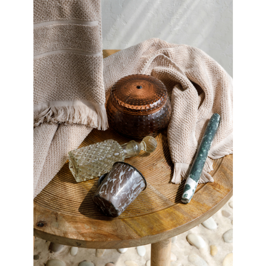 Полотенце для рук линии Essential украшено фактурным узором и мягкой бахромой в тон. За счет такого дизайна аксессуар органично подчеркнет любой интерьер ванной комнаты. Изделие станет отличной находкой для тех, кто любит качественные банные принадлежности из натуральных тканей. Ровная прочная пряжа изготавливается из лучших сортов длинноволокнистого хлопка методом тщательного прочесывания материала, что значительно улучшает ее качественные характеристики. Полотенце быстро впитывает влагу, оставляя приятное ощущение свежести и чистоты. Изделие отличается особенной износостойкостью: оно хорошо держит форму и сохраняет впитывающие свойства на протяжении долгого времени. Плотность ткани - 612GSM. Размер 50х90 ! Максимальная температура стирки 40° C ! Гладить при максимальной температуре 110° C ! Барабанная сушка запрещена ! Не отбеливать ! Сухая чистка запрещена