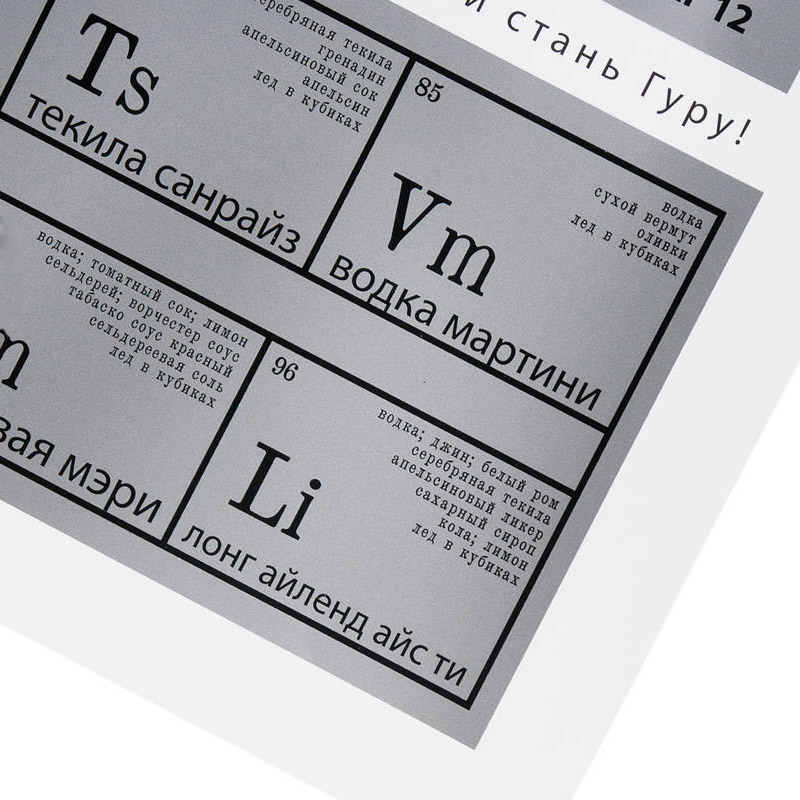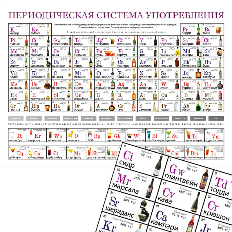 Как известно, Менделееву его таблица приснилась, но мало кто знает, что однажды в пятницу он увидел еще одну! Откройте для себя новый напиток, выпейте его и сотрите защитный слой у нужной клетки (монеткой, как на лотерейном билете). Вас ждет нелегкий, но познавательный путь к вершине алкогольного мастерства! Ощутите аромат зеленых виноградников Франции, темперамент Испании, и безудержное веселье пиратов Карибского моря. Только после того, как будут стерты 8 очередных клеток, вы можете перейти на новый уровень. Так что можно устроить из вечеринки настоящее соревнование. Упакован в тубус.