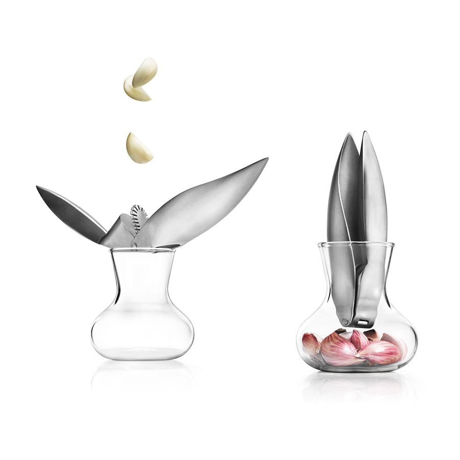 Пресс позволяет измельчить чеснок в одно движение. Помимо основной функции его можно использовать в комплекте со стеклянной колбой для хранения чесночных долек.