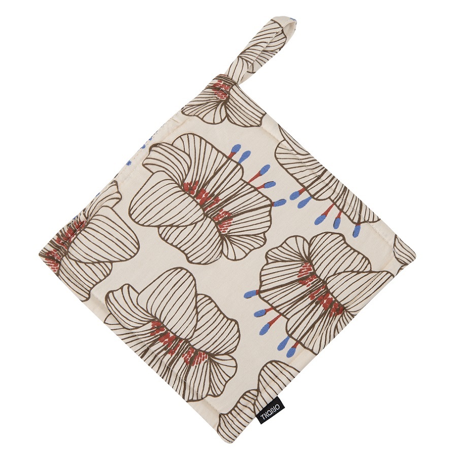 Прихватка из хлопка молочного цвета с принтом Цветы из коллекции Prairie – универсальный кухонный аксессуар. Дизайн изделия с крупными цветами станет ярким акцентом и гармонично впишется в любой современный стиль. Не нагревается даже при длительном контакте с горячими поверхностями. Внешняя часть выполнена из 100% гипоаллергенного хлопка. Наполнитель: полиэстер. Есть удобная петелька для подвешивания. Плотность ткани - 215GSM.