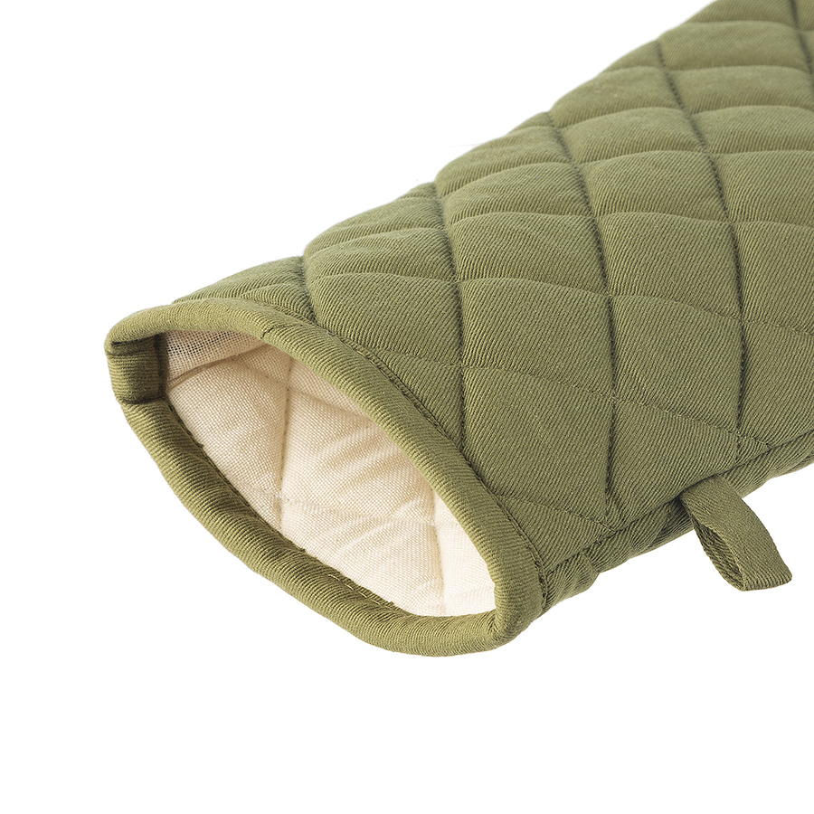 Прихватка-варежка из хлопка оливкового цвета из коллекции Essential – универсальный кухонный аксессуар. Изделие не нагревается и защищает руку при контакте с горячими поверхностями. Внешняя и внутренняя части выполнены из 100% гипоаллергенного хлопка. Наполнитель: полиэстер. Есть удобная петелька для подвешивания.