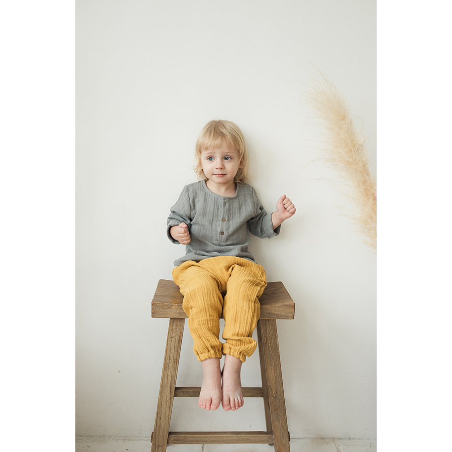 Материал: органический хлопок. Он прочнее и мягче обычного, выдерживает больше стирок, лучше пропускает воздух и впитывает влагу, что особенно важно для детской кожи. Модель представлена несколькими размерами в трех цветах: пыльная роза, серый, горчичный.