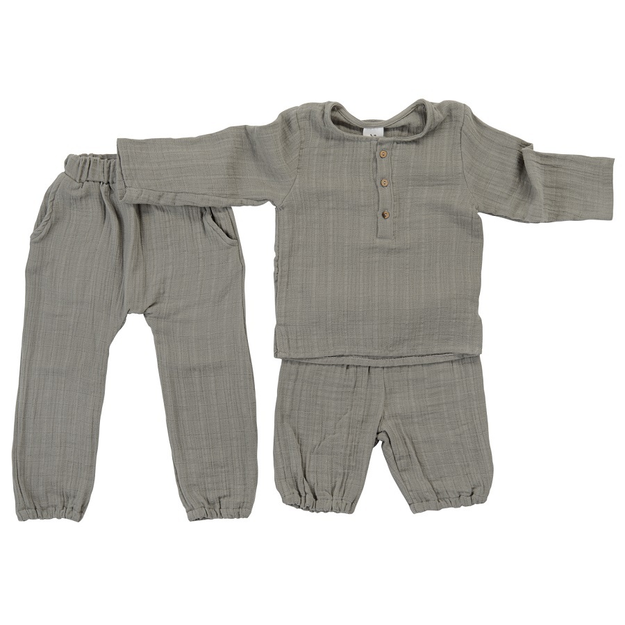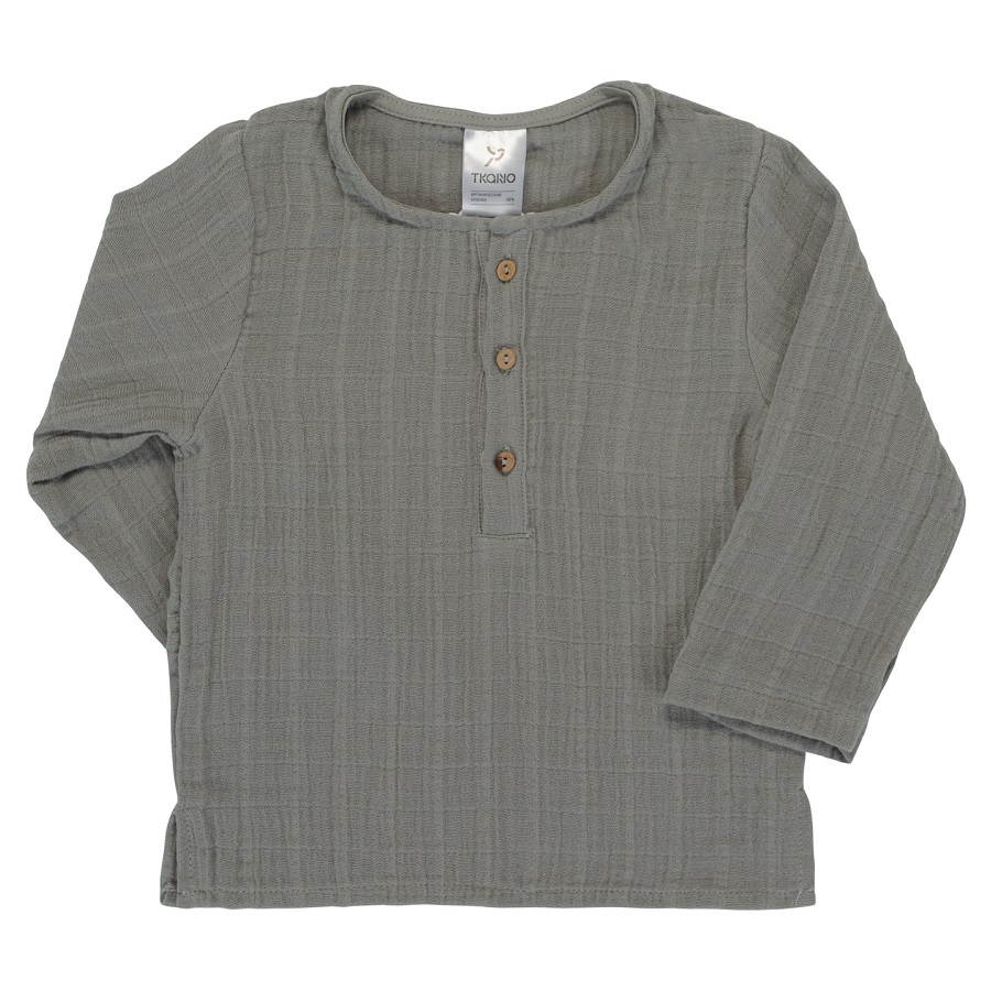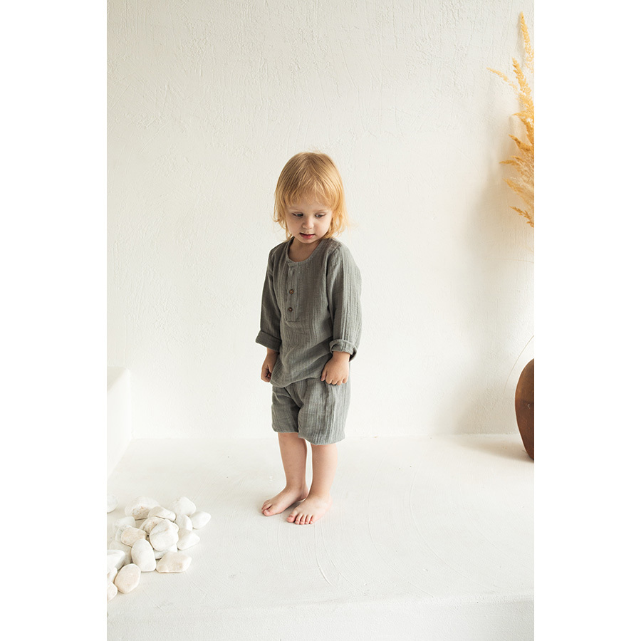 Рубашка из хлопкового муслина серого цвета из коллекции Essential выполнена в лаконичном стильном дизайне, поэтому подойдет и мальчикам, и девочкам. Благодаря широкой горловине и пуговицам спереди, ее легко надевать и снимать. Можно дополнить шортами или штанами такой же расцветки.
