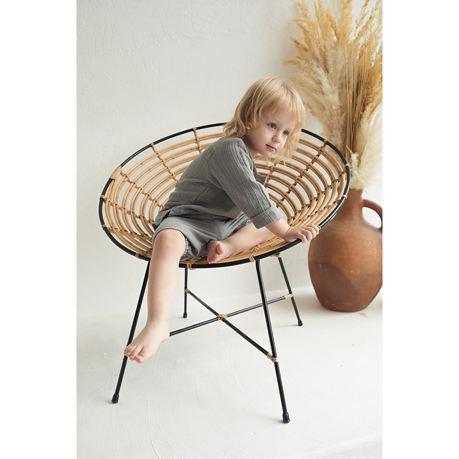 Материал: органический хлопок. Он прочнее и мягче обычного, выдерживает больше стирок, лучше пропускает воздух и впитывает влагу, что особенно важно для детской кожи. Модель представлена несколькими размерами в трех цветах: пыльная роза, серый, горчичный.