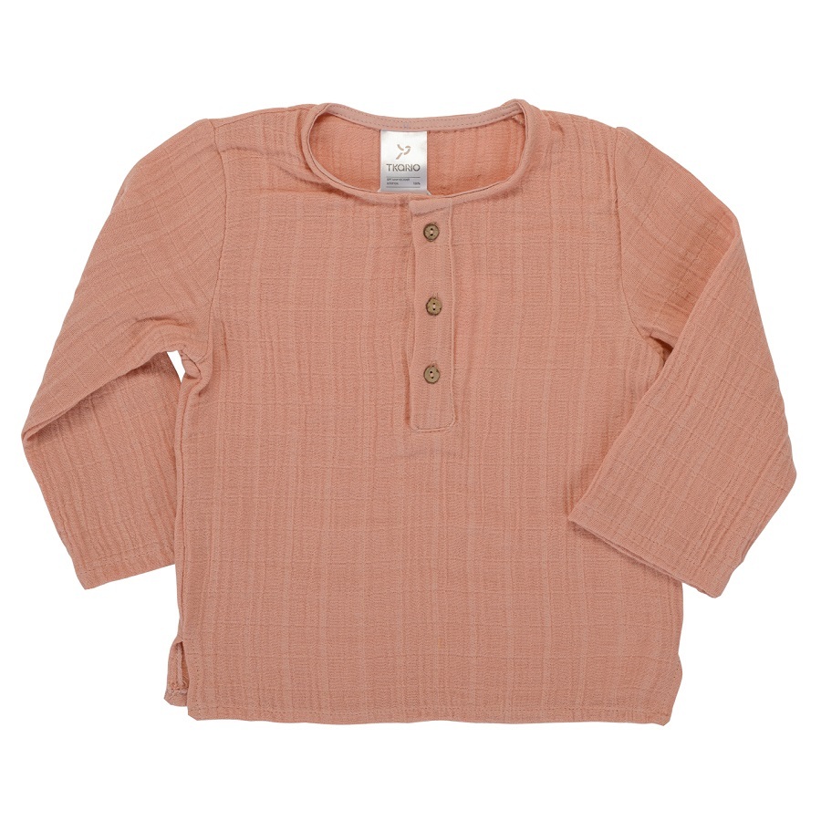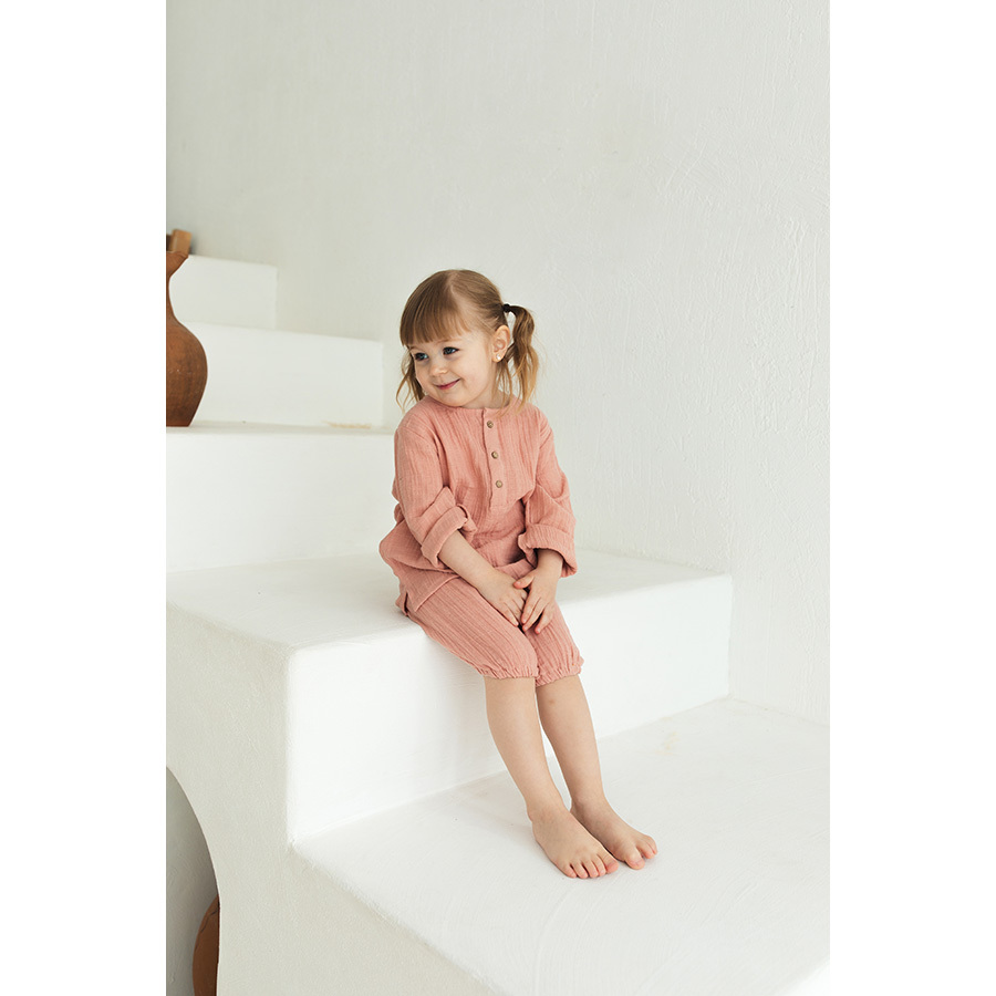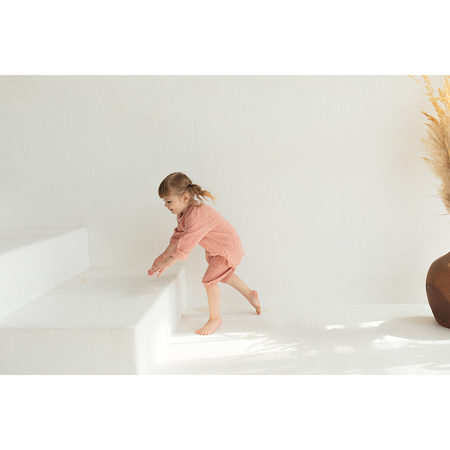 Рубашка из хлопкового муслина цвета пыльной розы из коллекции Essential выполнена в лаконичном стильном дизайне, поэтому подойдет и мальчикам, и девочкам. Благодаря широкой горловине и пуговицам спереди, ее легко надевать и снимать. Можно дополнить шортами или штанами такой же расцветки.