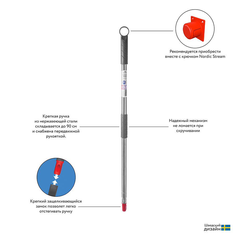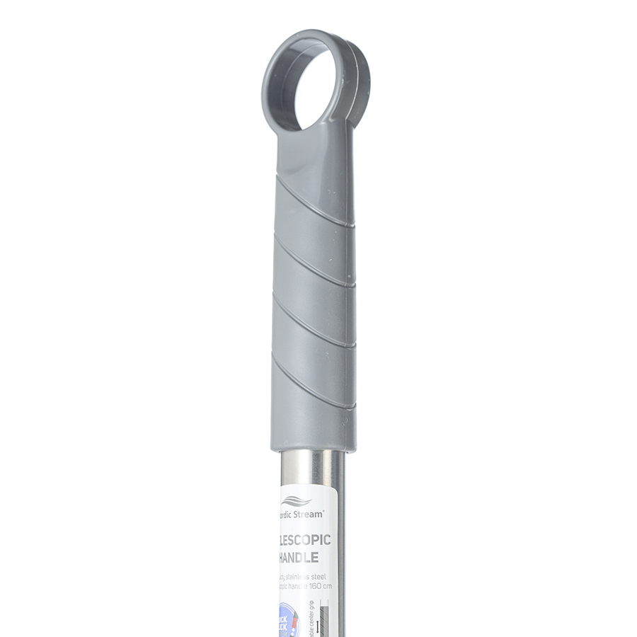 Телескопическая ручка для швабры длиной 90 см может раздвигаться до 160 см. Она выполнена из прочной нержавеющей стали, устойчивой к механическим воздействиям и коррозии. В тандеме с насадкой из микрофибры бренда Nordic Stream ручка эффективно справится с любыми загрязнениями даже в труднодоступных местах. Аксессуар снабжен удобным механизмом, который фиксирует две его части в раздвижном положении, препятствуя самопроизвольному сложению. Также ручка дополнена пластиковым колпачком с кольцом для подвешивания. Передвижную пластиковую рукоятку можно фиксировать на любой высоте для комфортного использования.