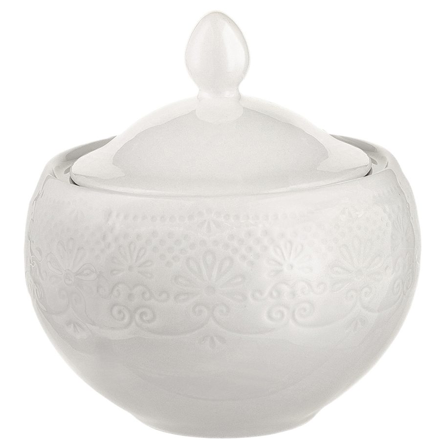 Сахарница фарфоровая Tracery – прекрасное решение для повседневной и праздничной сервировки стола. Изюминкой линейки является необычная, приятная на ощупь рельефная поверхность, которая придает посуде интересный вид. Материал изготовления является экологичным, легко моется, не впитывает запахи и загрязнения. Емкость для сахара оснащена крышкой, которая органично завершает силуэт и защищает содержимое от пыли, влаги и заветривания.