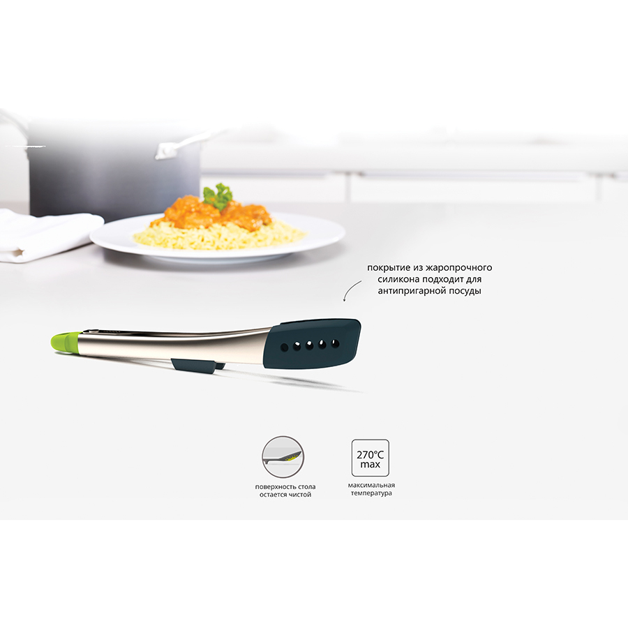 Кухонные щипцы из нержавеющей стали. Входят в серию кухонных приборов Elevate™, разработанную для поддержания максимального порядка во время приготовления пищи. Специальный утяжелитель в рукоятке постоянно удерживает наконечники навесу, благодаря чему они не касаются рабочей поверхности. Преимущества: - покрытие рабочей поверхности из жаропрочного силикона - подходит для антипригарной посуды - выдерживают до 270°C.
