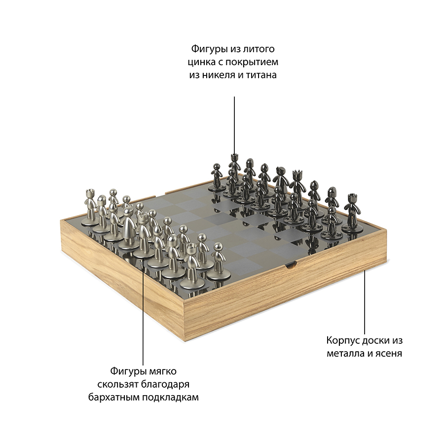 Шахматные фигуры выполенены из металла с никелевым и титановым покрытиями и бархатными накладками на основании, которые защищают поле от царпапин. Металлическое шахматное поле заключено в деревянную коробку из натурального ясеня, которая также служит местом для хранения шахматных фигур.