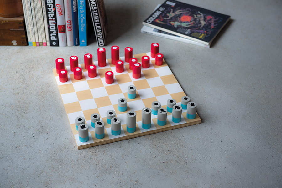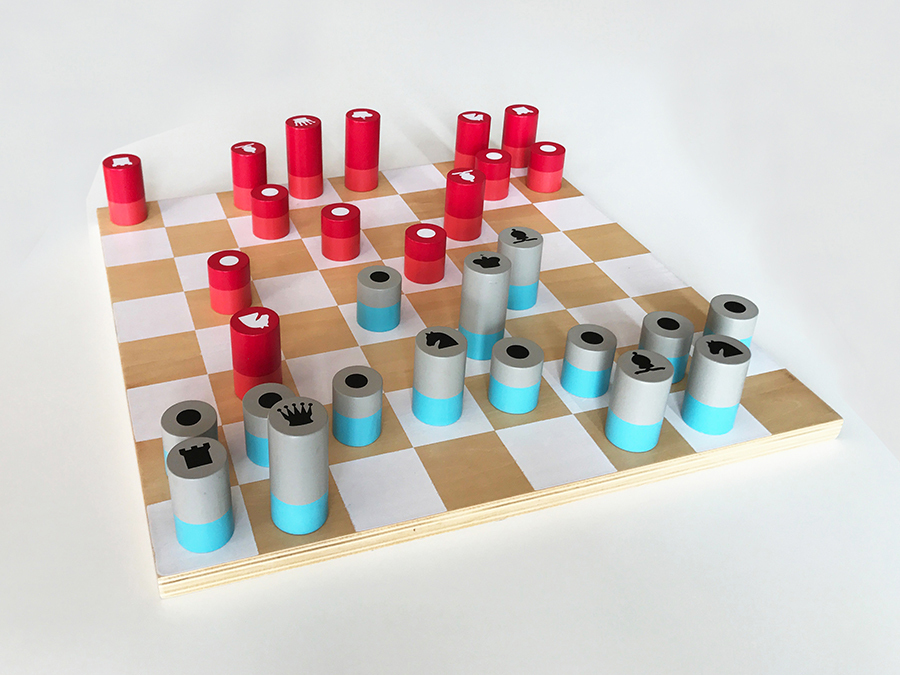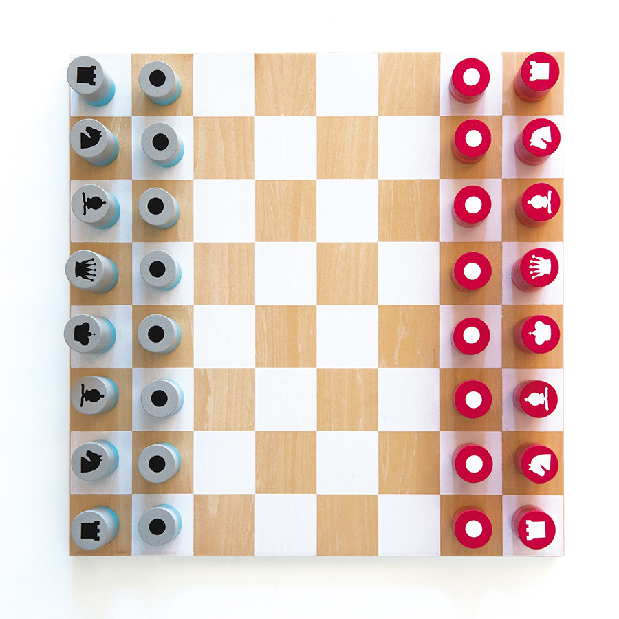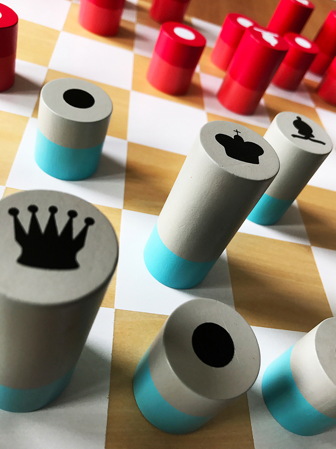 Деревянные шахматы обязательно понравятся всем любителям настольных игр. Фигурки выполнены в виде цилиндрических фишек с различными изображениями мастей. Набор представлен в нестандартном сочетании цветов: красно-коралловом и серо-голубом. Материалы: доска – дерево и фанера, фишки – дерево. Размеры: 40х40х1,5 см. Игра рассчитана на двоих взрослых или детей в возрасте от 7 лет.