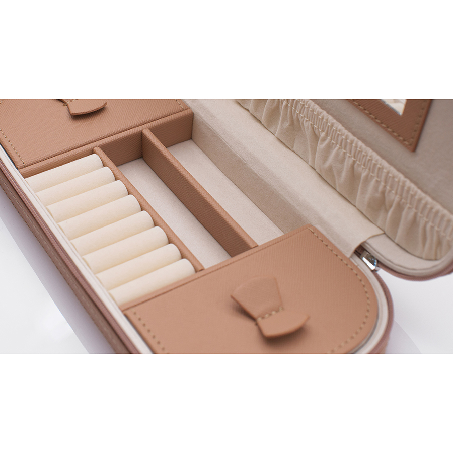 Шкатулка включает несколько секций для хранения украшений, кармашки для колец и зеркало. Застегивается на надежную молнию.