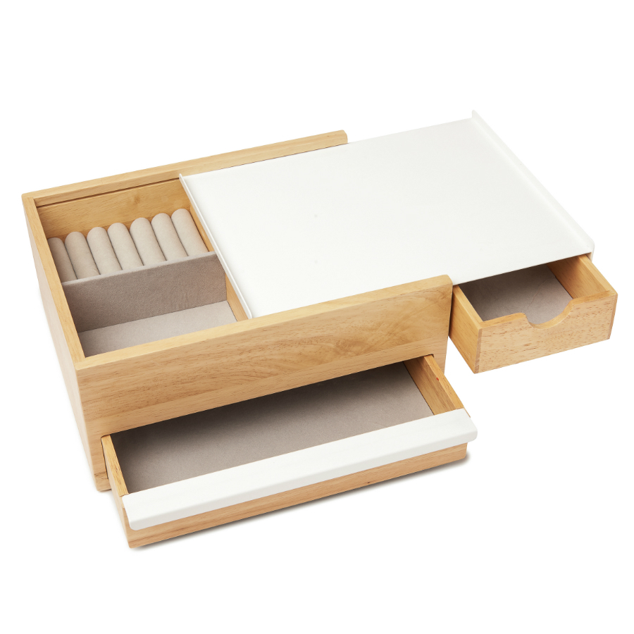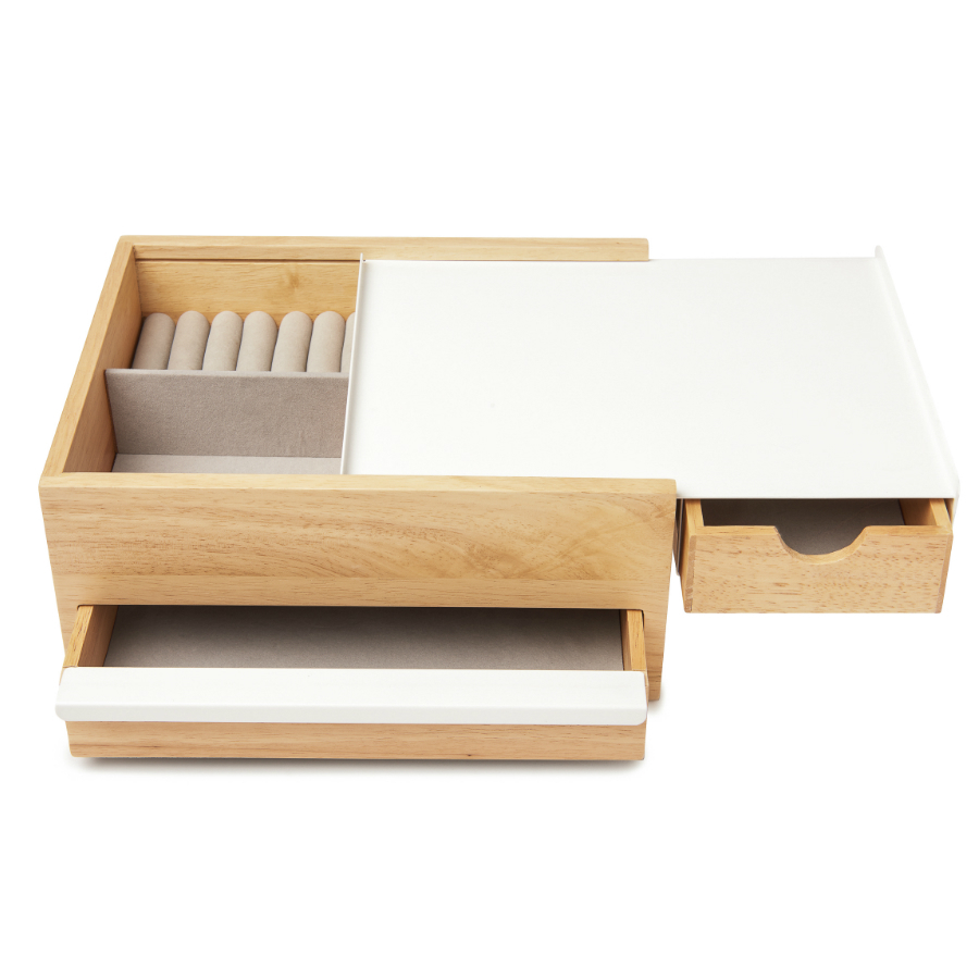 Большая деревянная шкатулка для украшений с несколькими отделениям. Верхнее отделение оснащено кармашками для колец или запонок и небольшими ящичками для прочих мелочей. Нижняя часть предназначена для хранения более крупных аксессуаров: часов или браслетов. Благородное сочетание натурального дерева и белого металла делают шкатулку ярким представителем скандинавского модернизма. Дизайн: Sung wook Park